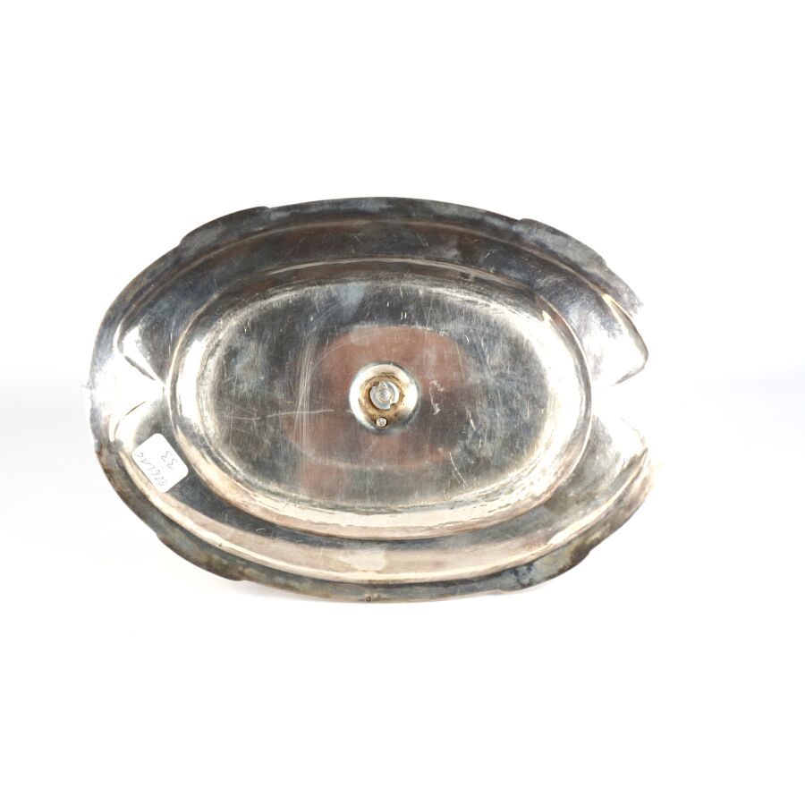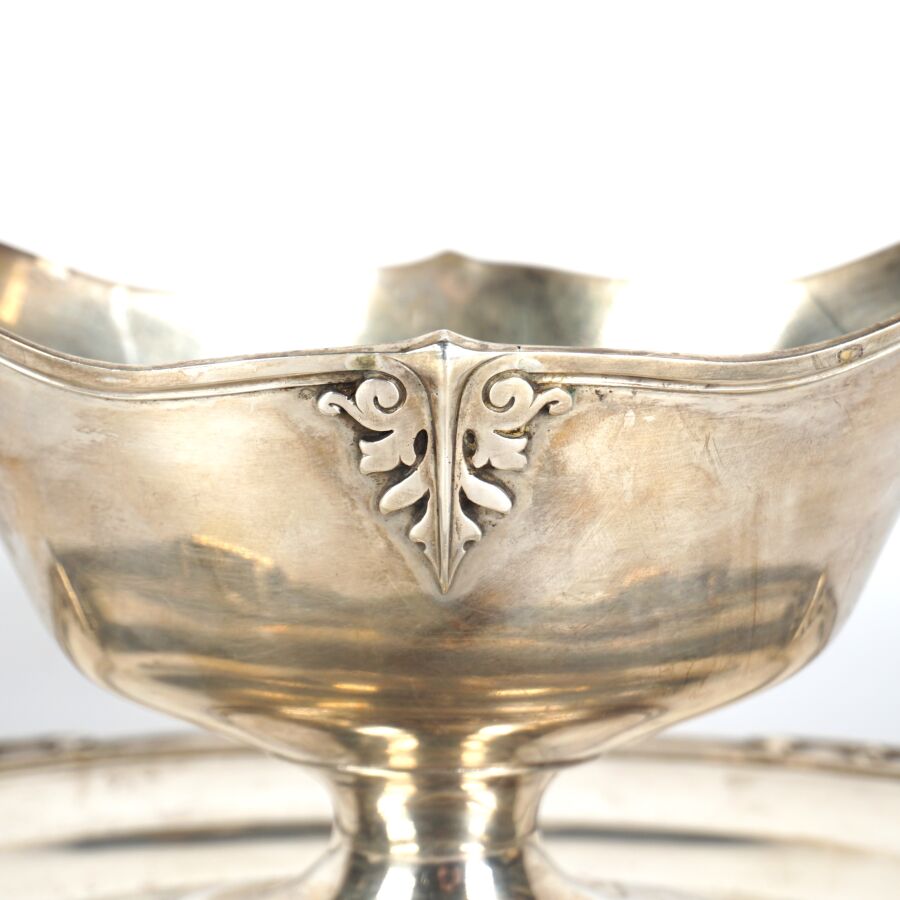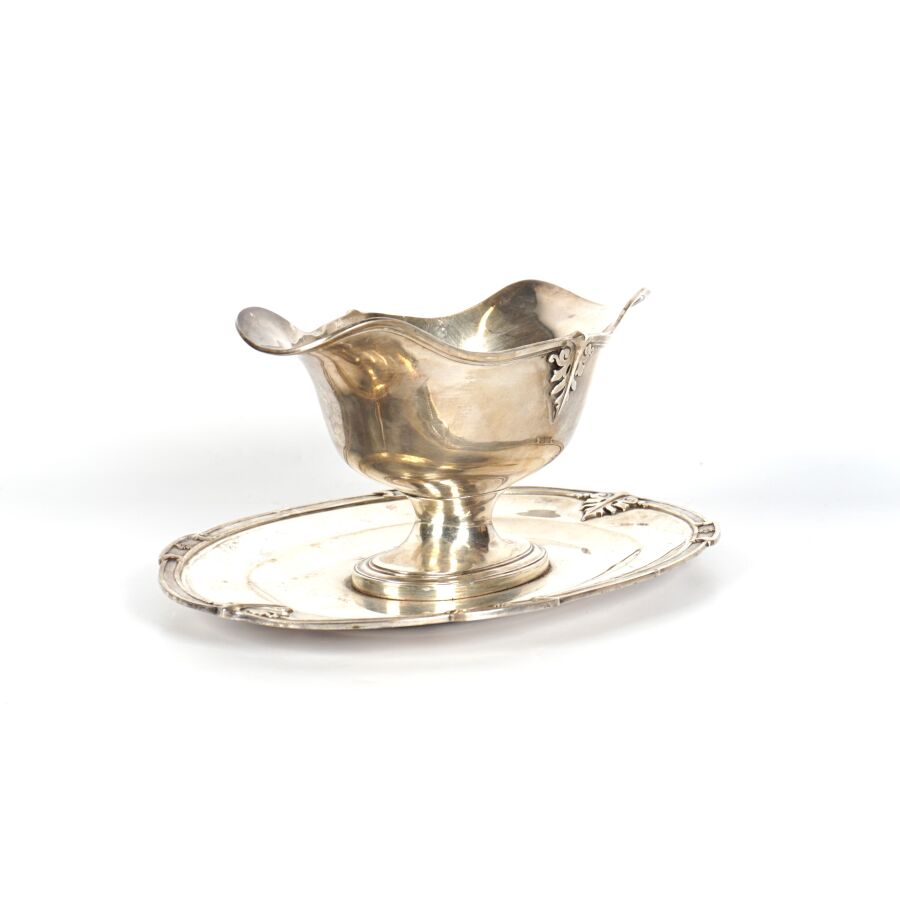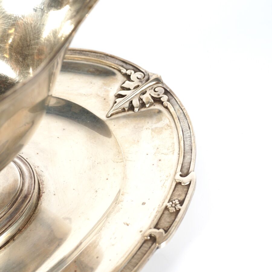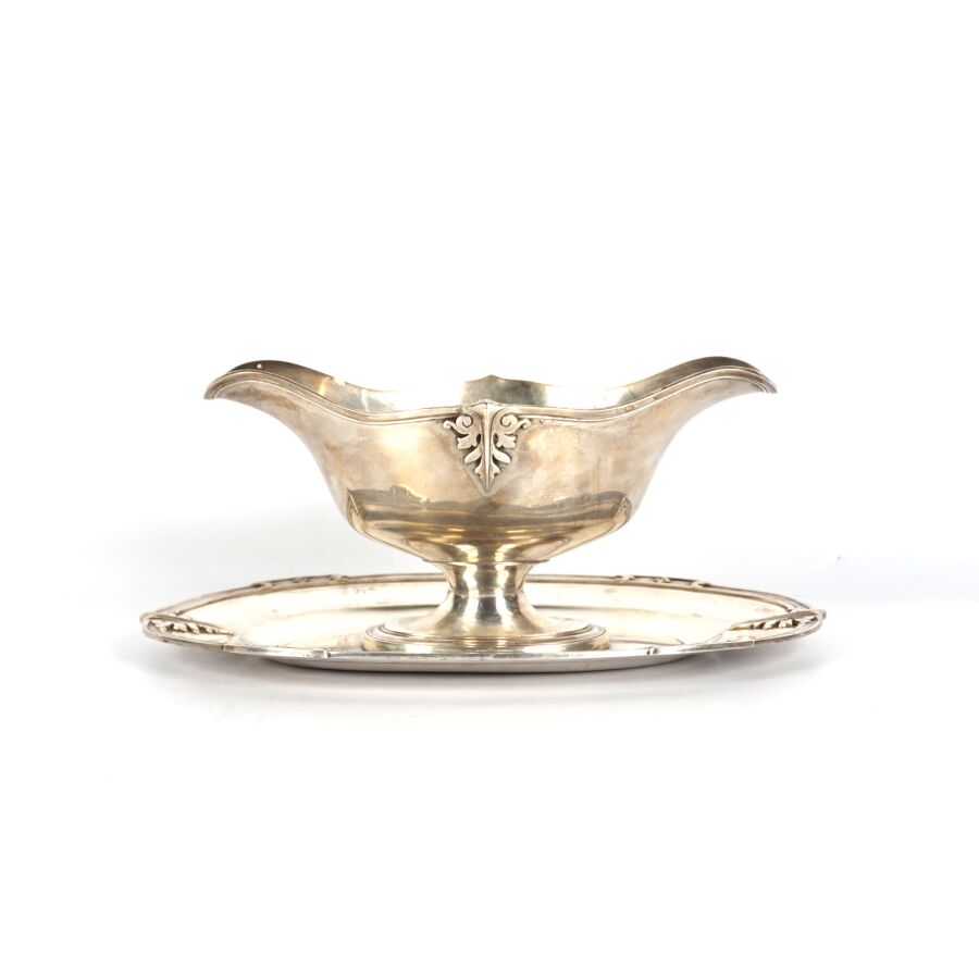 Léontine COMPERE (Vve Ernest COMPERE) : Saucière et son plateau fixe en argent, poinçon Minerve 1er titre (950/oo), à décor de ferronneries, L. 25.7 cm. Poids brut : 666 g environ.