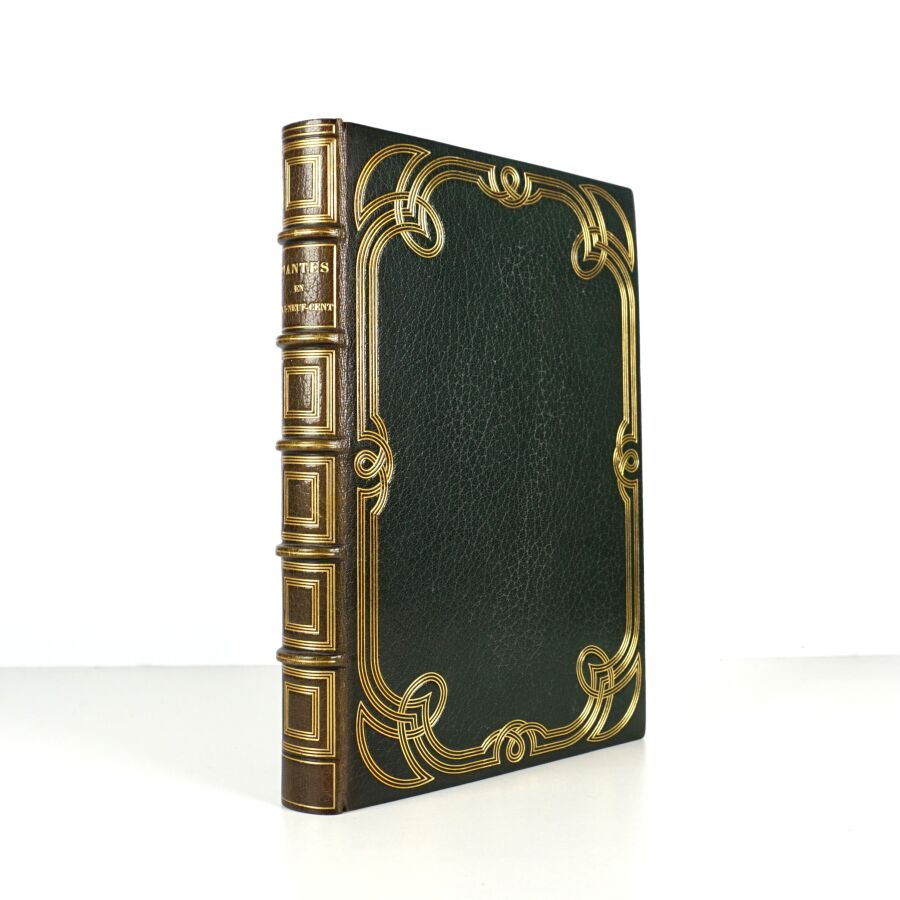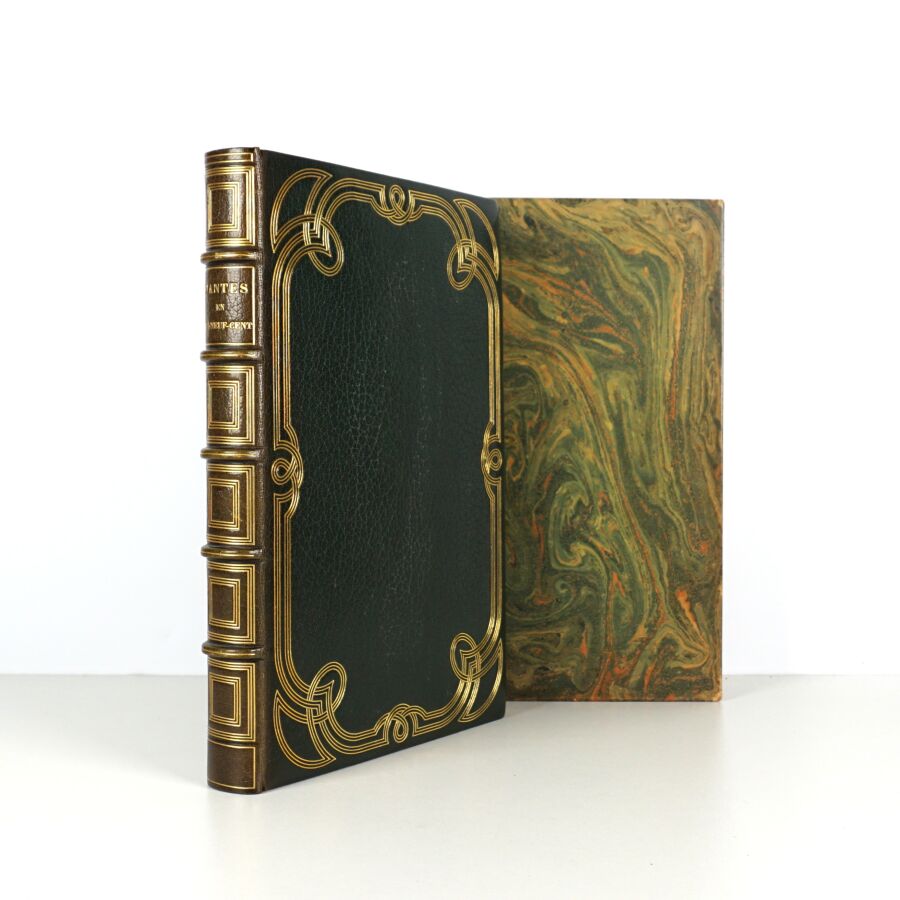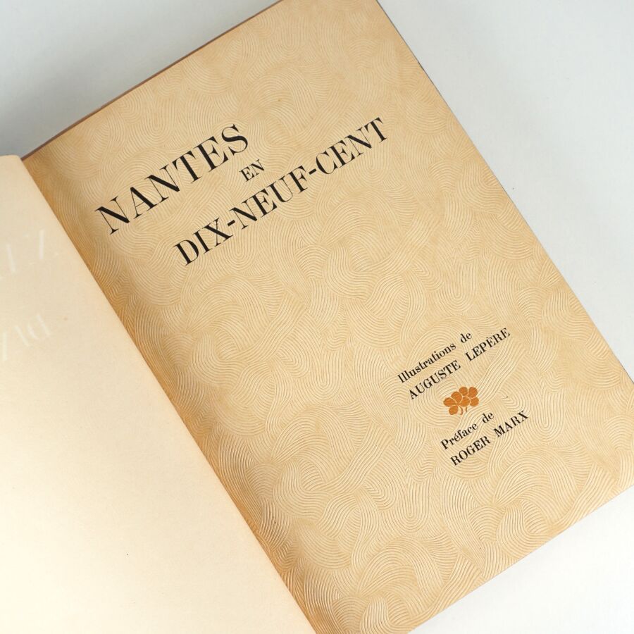 LEPÈRE (Auguste). Nantes en dix-neuf cent. Nantes, Émile Grimaud et fils, s. d.. Grand in-8 (27,5 x 19,5 cm), maroquin vert, dos à nerfs orné, titre doré, encadrement de filets dorés entrelacés sur les plats, contreplats bordés et encadrés de filets dorés, coupes filetées, tranches dorées, couv. conservées, étui bordé (Joly Fils).