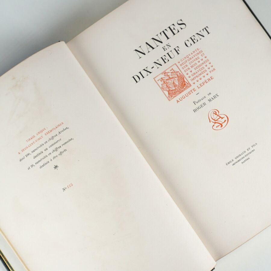 Tirage unique à 220 exemplaires (n° 125), sur papier de cuve filigrané au titre et aux armes de Nantes spécialement fabriqué par les usines d'Arches.