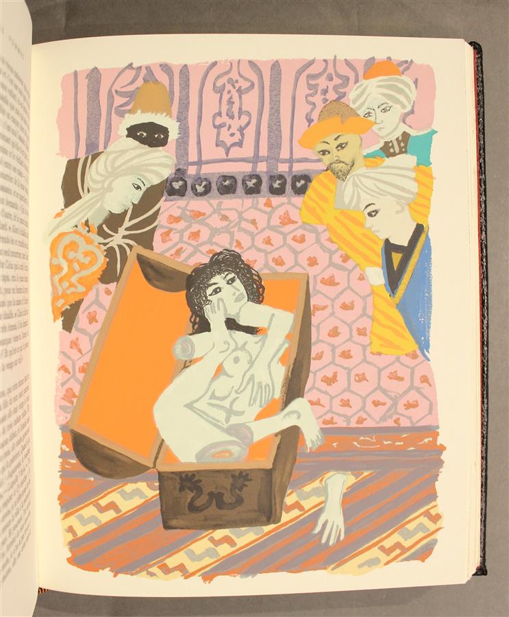 Les mille et une nuits - Paris ; Union Latine d'Editions, 1964 - 8 volumes grand In-8° - Illustrations hors-texte en couleurs par Chapelain-Midy - Reliure éditeur cuir noir, emboîtages bordés - Dos à nerfs (légers frottements à ceux-ci) titrés et tomés orange - Têtes dorées - Bon exemplaire numéroté sur pur fil Dame blanche.