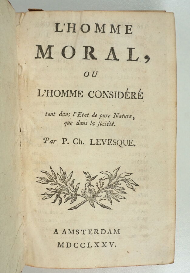LEVESQUE (P. Ch.) - L'homme moral, ou l'homme considéré tant dans l'état de pure nature, que dans la société - Amsterdam ; Sans nom, 1775 - 1 volume In-12° - Titre quasi détaché - Reliure de l'époque basane havane marbrée (partie de coupes frottée, 1 coin usé, quelques petits trous de ver aux mors) - Dos lise orné (coiffe supérieure accidentée) - Pièce de titre maroquin bordeaux - Tranches rouges - Grand ex-libris armorié au 1er contre plat.