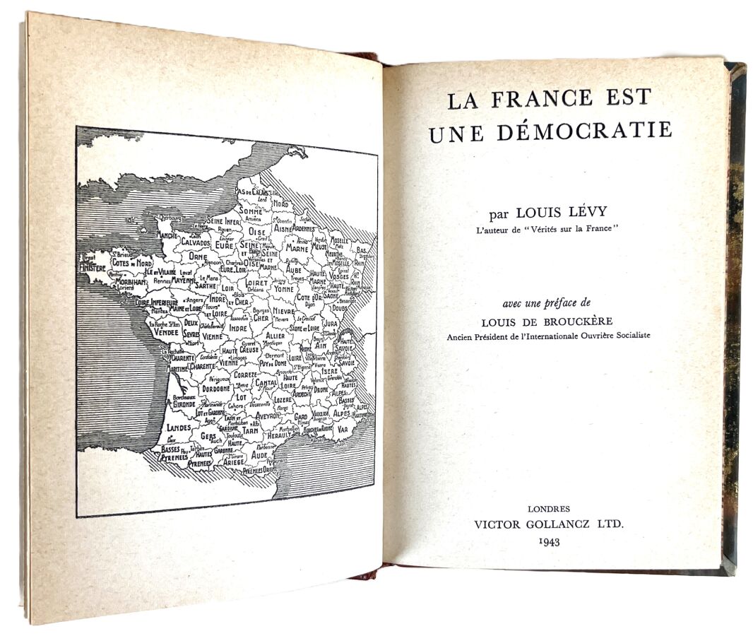 LÉVY (Louis) - La France est une démocratie - Londres ; Victor Gollancz, 1943 - 1 volume In-12° - Carte de la France en frontispice - Reliure de l'époque demi-chagrin havane (1er mors partiellement frotté) - 1ère couverture conservée - Dos à nerfs orné, titré et monogrammé V. A. - Bon exemplaire enrichi d'1 envoi autographe signé de l'auteur daté d'octobre 1943 : " A mon vieil ami Vincent Auriol en souvenir de 25 années de luttes communes avec l'assurance de ma plus fidèle affection "