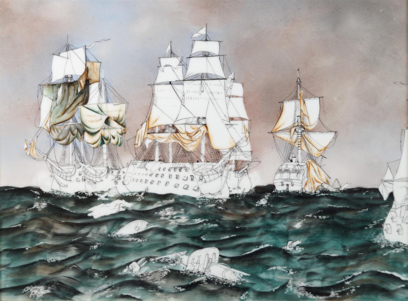 LIMOGES : "Bataille navale", plaque en porcelaine à décor peint polychrome, marque au dos, 28 x 38 cm.