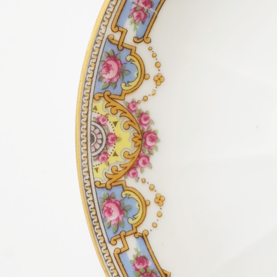 LIMOGES : Partie de service à café en porcelaine émaillée polychrome à décor de frises et rehauts d'or sur l'aile, comprenant 12 tasses et 12 sous-tasses (petites taches, quelques égrenures).