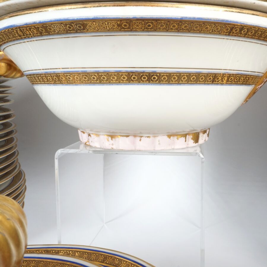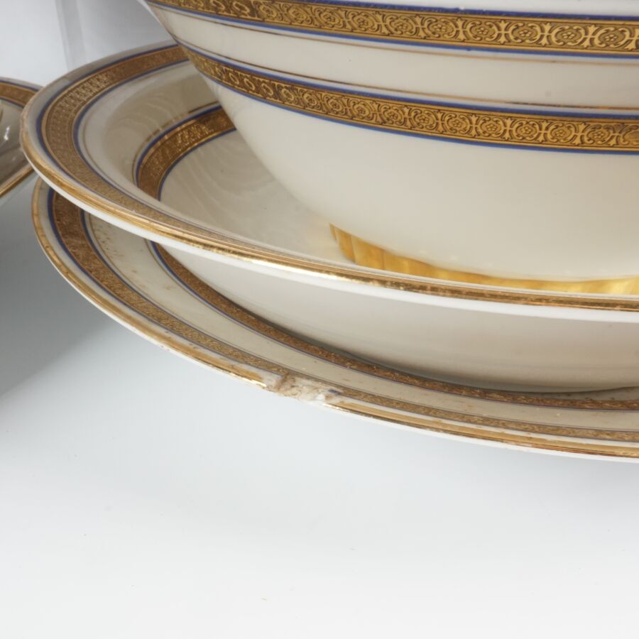 LIMOGES : Partie de service de table en porcelaine émaillée en blanc à décor de liseré doré et de liseré bleu comprenant 1 soupière, 1 légumier, 1 plat rond, 1 plat creux, 1 compotier, 2 présentoirs sur piédouche, 1 saucière, 2 raviers, 2 plats ovales, 12 assiettes à dessert, 12 assiettes creuses, 36 assiettes plates, marqué au tampon dessous, L. plat ovale 41 cm (éclats, fêles, usures).
