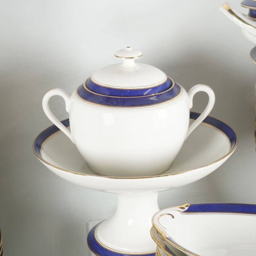 LIMOGES : Partie de service en porcelaine émaillée et rehauts d'or, l'aile ornée d'un liseré bleu nuit, comprenant 43 assiettes plates, 12 assiettes creuses, 1 saladier/compotier, 2 paires de présentoirs sur piédouche, 1 moutardier, 1 saucière, 1 soupière, 2 plats ronds creux, 4 raviers, 2 plats ovales, 1 légumier et 34 assiettes à dessert, marqué dessous (quelques traces, petits éclats et usures).