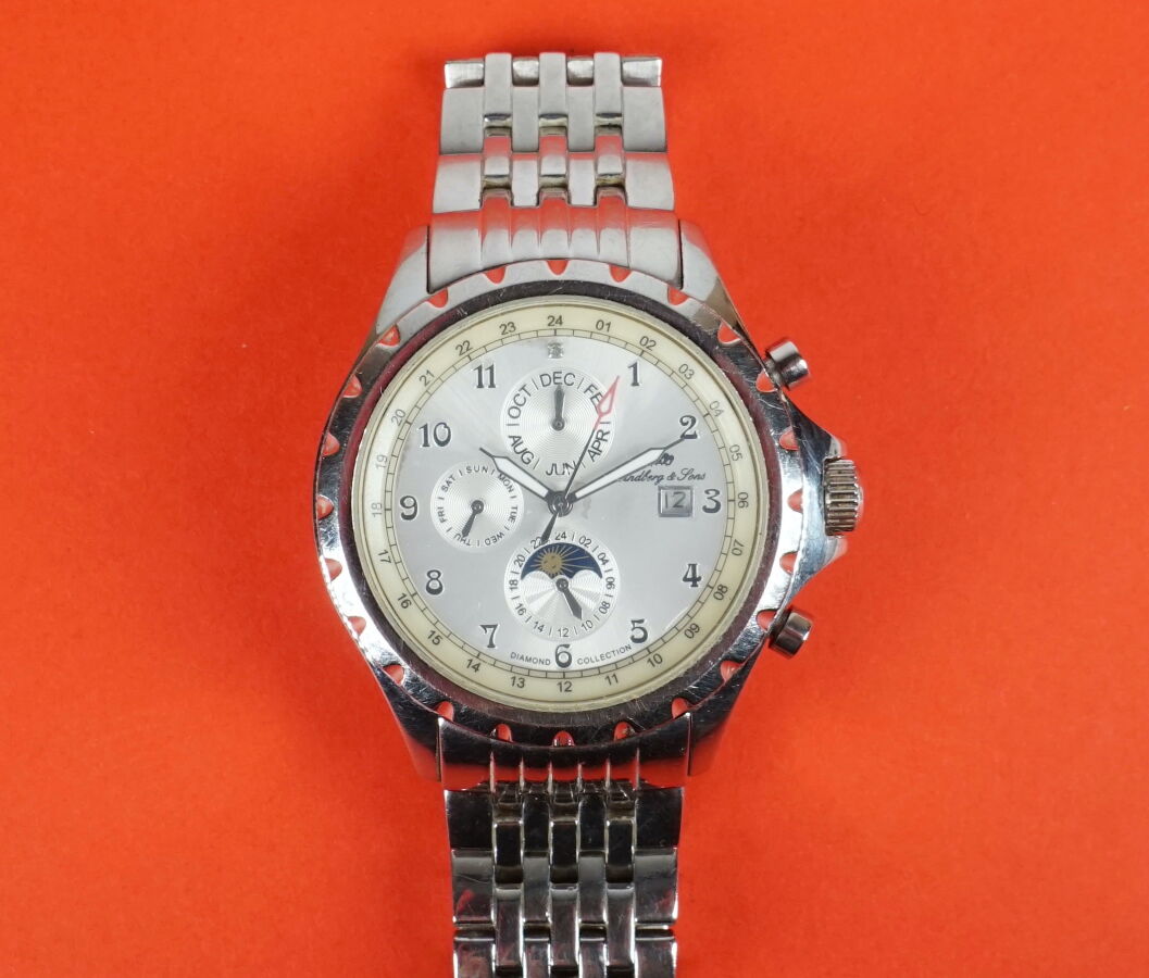 LINDBERG & SONS : Montre en acier, boitier rond 45 mm, cadran argenté chiffres arabes, 3 compteurs, dateur à 3h, annoté "Diamond Collection", fond squelette signé et numéroté LS11-173B-2, bracelet articulé boucle déployante siglée.