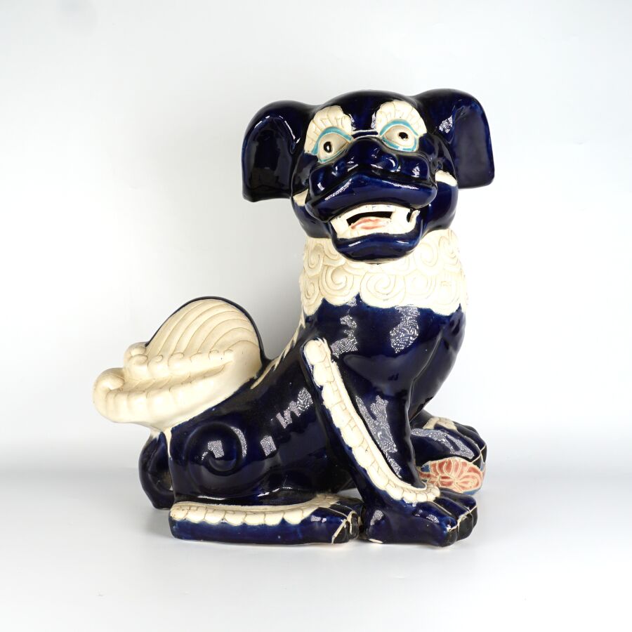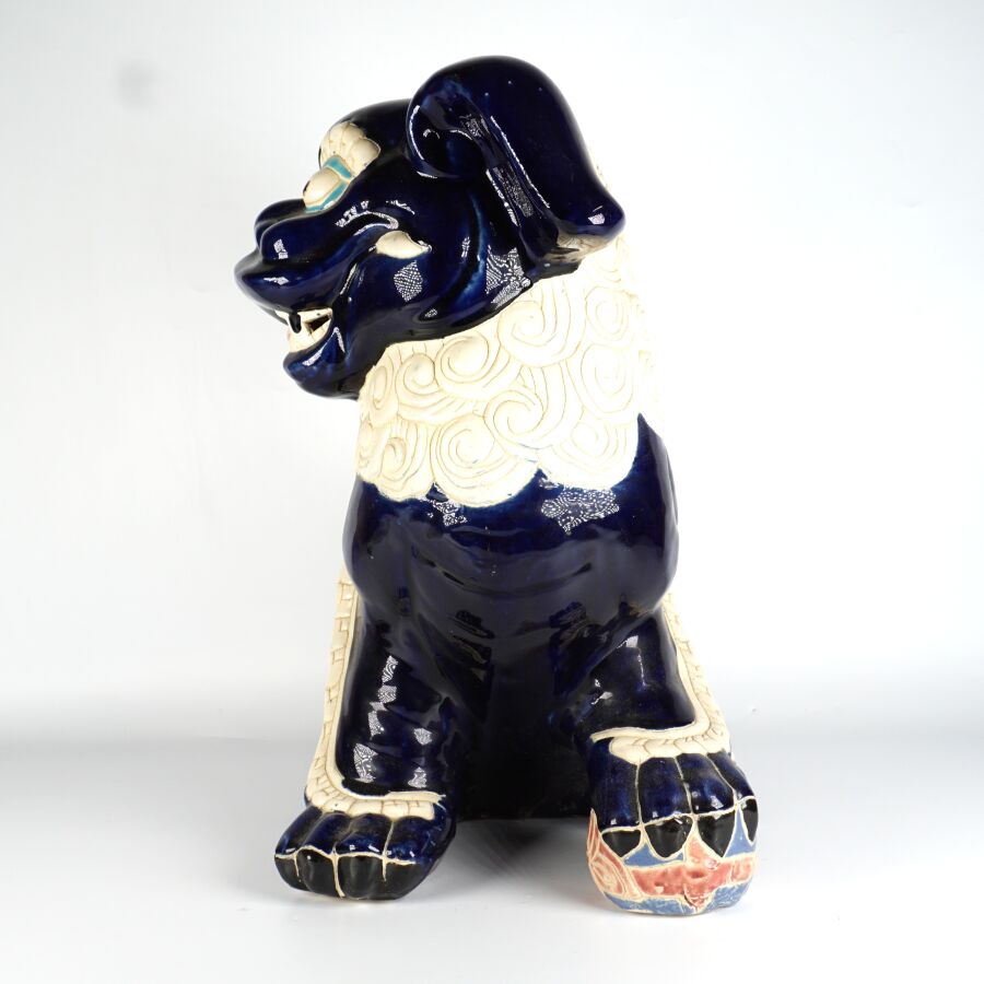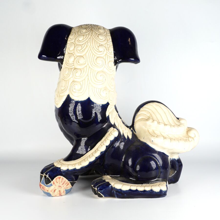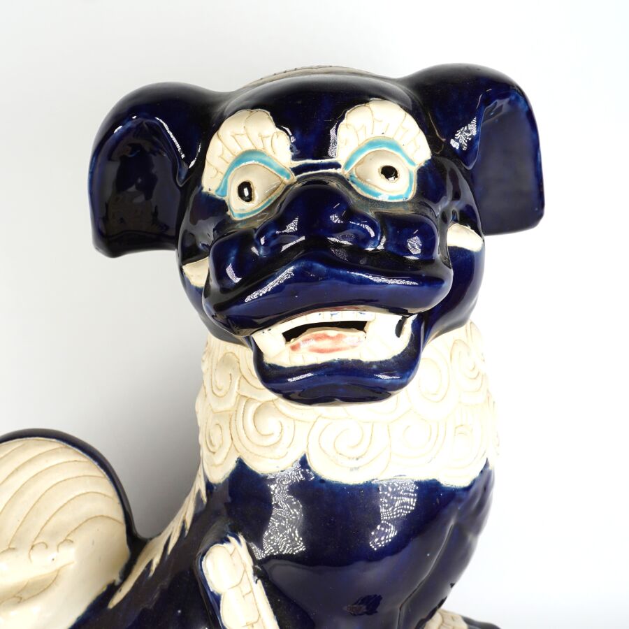 Lion bouddhique en grès émaillé beige et bleu, dans le goût de la Chine, travail décoratif moderne, H. 44 x 40 cm.