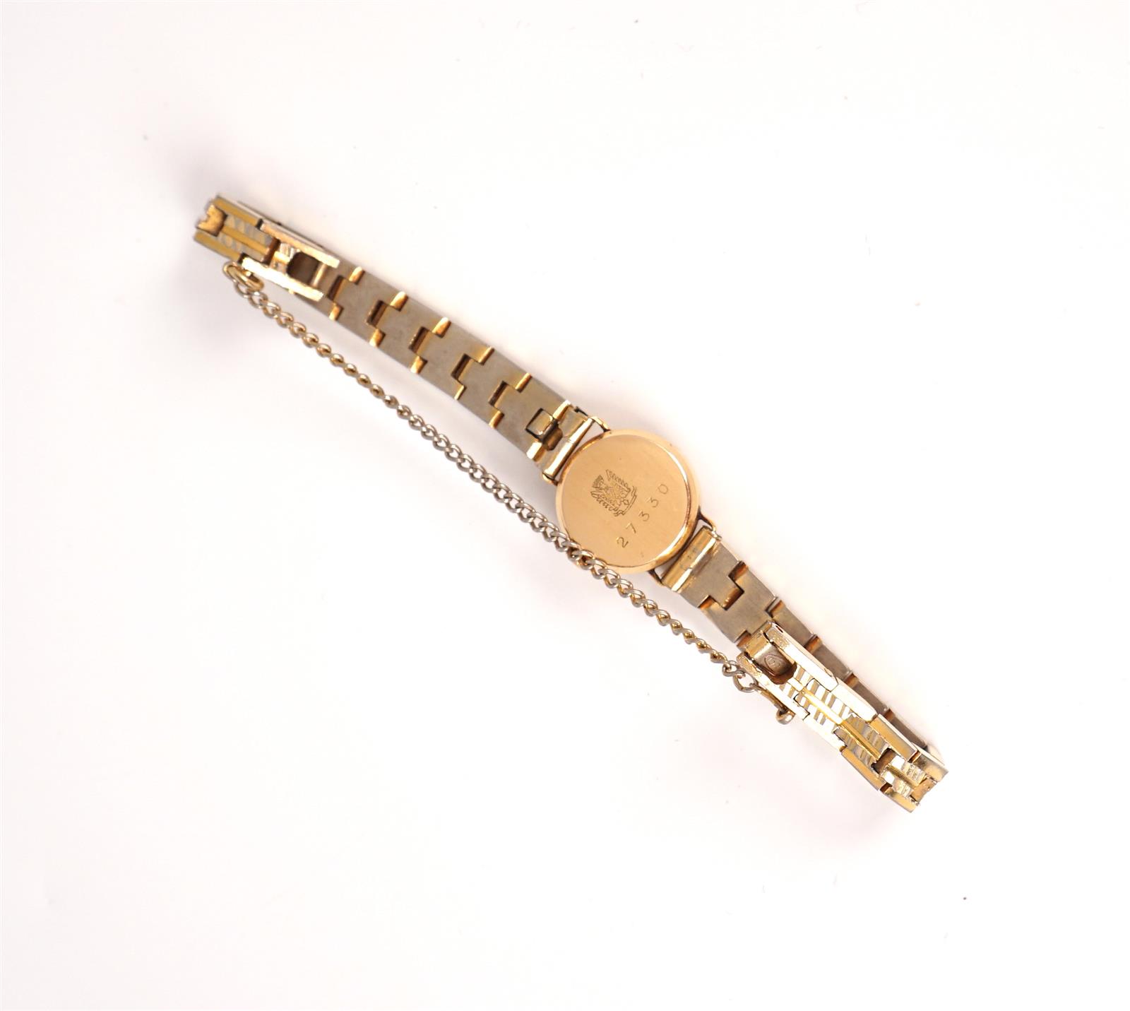 LIP : Montre de dame circa 1950, boitier circulaire en or jaune 18 K (750/oo), numérotée 27330, bracelet articulé en métal doré. Poids brut : 25 g environ.