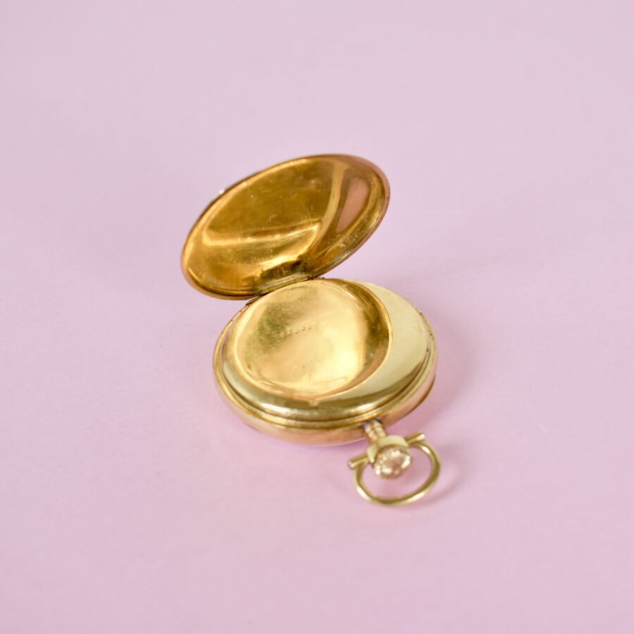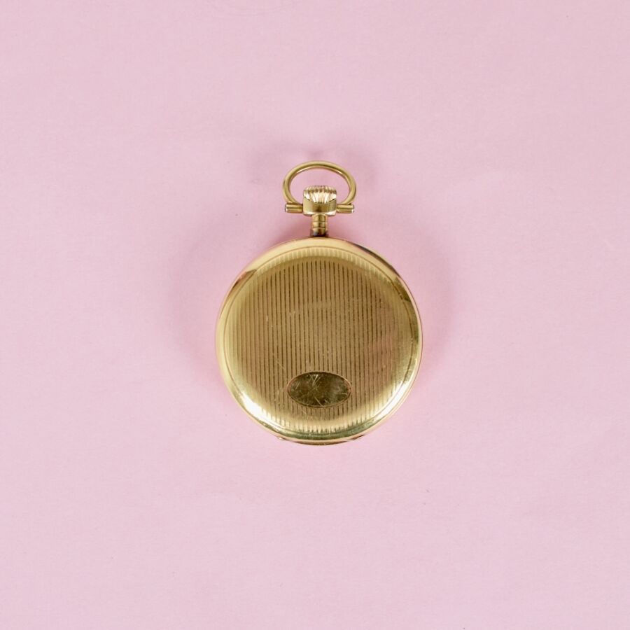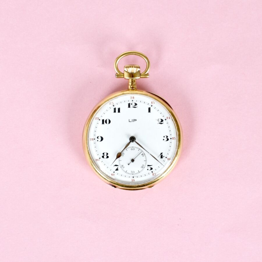 LIP : Montre de poche modèle « Type Courant » en or jaune 18K (750/oo), cadran émaillé blanc à chiffres arabes sur minuterie chemin de fer, compteur des secondes à 6h, le dos ciselé, cadran signé et fond numéroté. Dim. : 4.7 cm. Poids brut : 67 g environ. (usures sur le boîtier, menues rayures au verre).