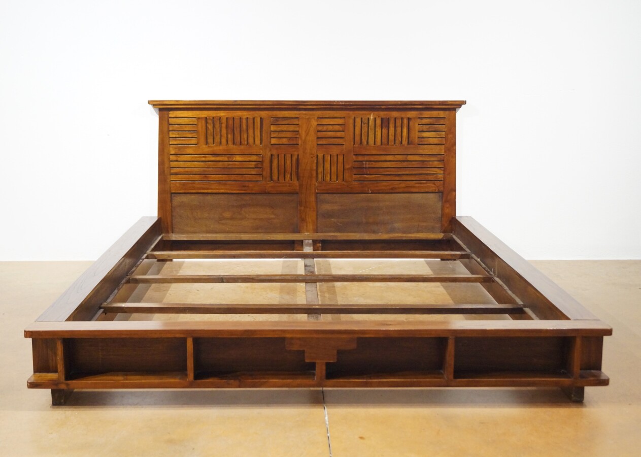 Lit de style colonial en bois exotique, le cadre présente des casiers sur trois côtés, tête de lit à décor de carrés et rectangles striés, H. 89.5 cm., dim. couchage : 200 x 160 cm. (rayures d'usage, démonté)