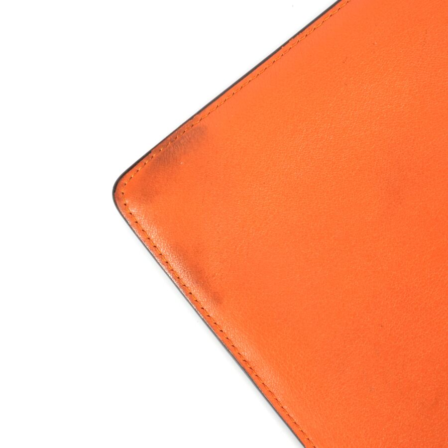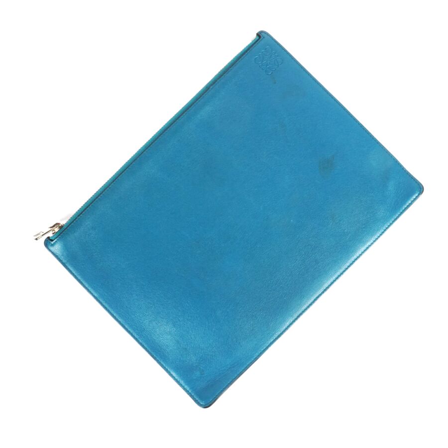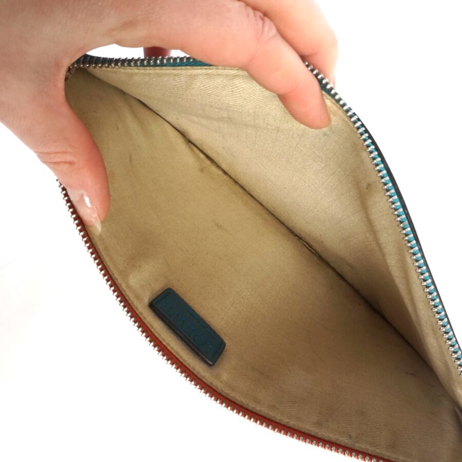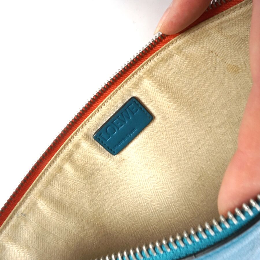 LOEWE : Pochette porté main en cuir lisse bicolore, une face de couleur orange, l'autre de couleur bleue, fermeture zippée, intérieur en tissu beige, plaque en cuir à l'intérieur, Dim. 20.5 x 27.5 cm (traces, petites usures d'usage).