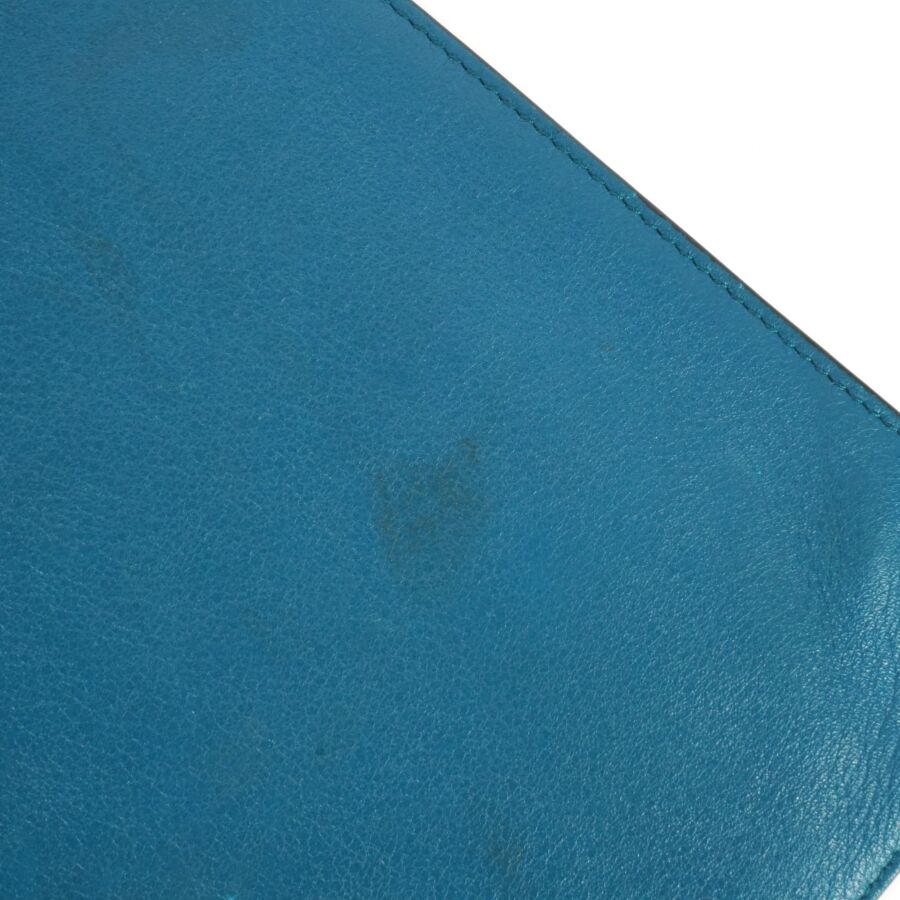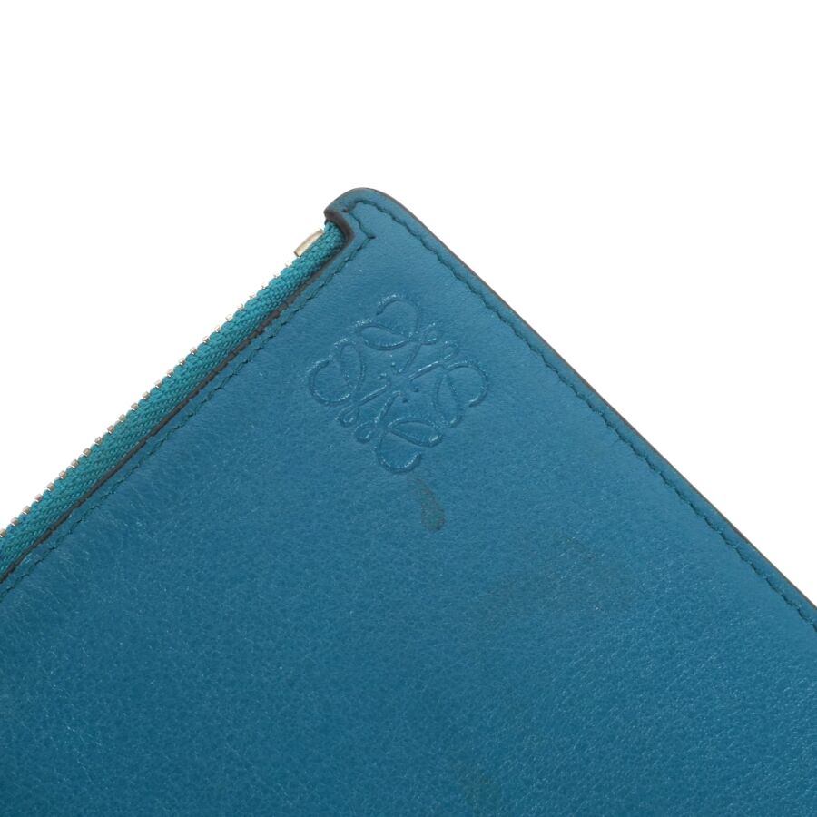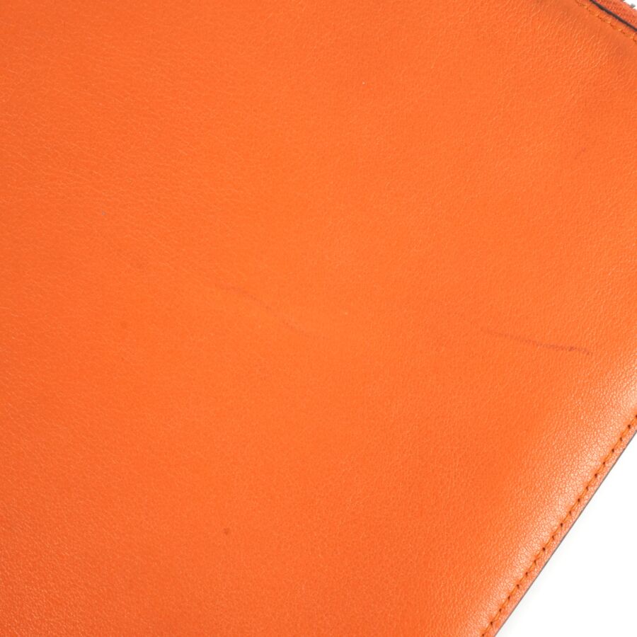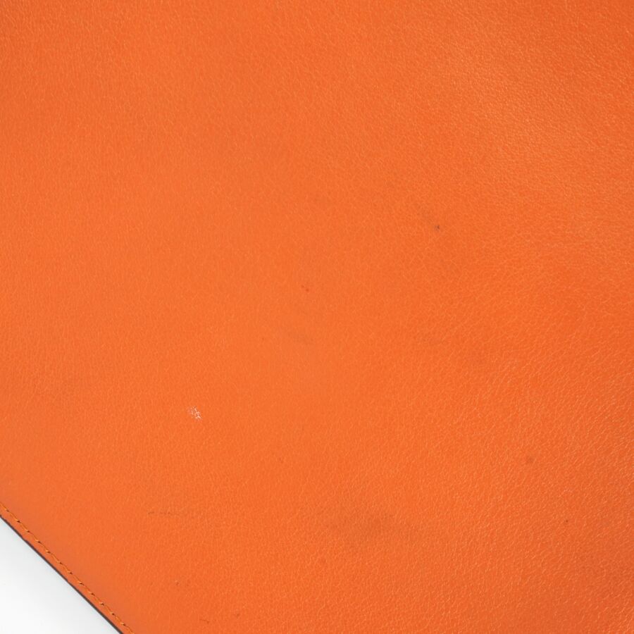 LOEWE : Pochette porté main en cuir lisse bicolore, une face de couleur orange, l'autre de couleur bleue, fermeture zippée, intérieur en tissu beige, plaque en cuir à l'intérieur, Dim. 20.5 x 27.5 cm (traces, petites usures d'usage).