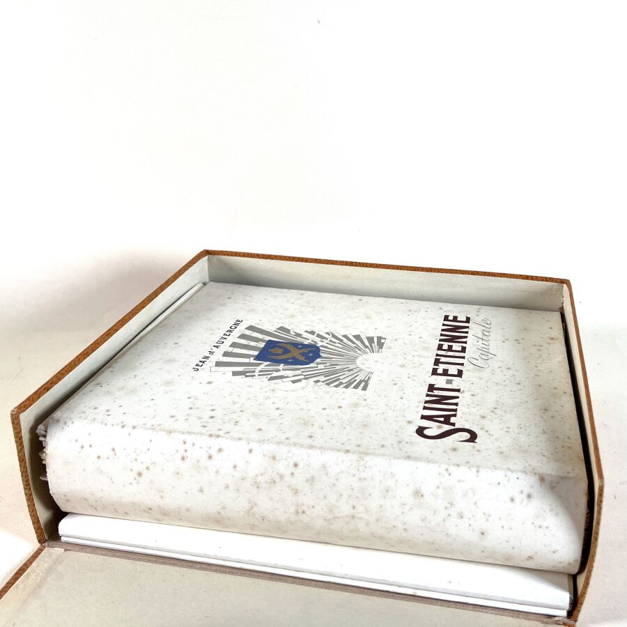 [LOIRE] - AUVERGNE (Jean d') & collaborateurs - Saint-Étienne capitale du travail et du coeur - Saint-Etienne ; Presses de la Loire Républicaine, 1952 - 1 volume In-4° en feuilles non coupées, couverture rempliée titrée et ornée au 1er plat (roussie), étui titré au dos - Illustré par des artistes des Trois Vallées (Furan-Gier-Ondaine) du Grand Saint-Étienne : Georges Tautel, Jean Paret, Denise Peillon, Marius Galleras, Henri Jeanblanc, Fernand Guibouret, Nicolas Cizeron, Antonio Herraiz, Noël Badol, Marie Arnaud, C.-A. Boissier, Pierre Umiglia, Marcel Peillon, Joanny-Durand, docteur Jean Peyrache, Jo Roux, Mathieu Rocher - Bon exemplaire en édition originale hors commerce enrichie d'1 envoi autographe signé de Jean d'Auvergne : " Offert en très respectueux hommage et témoignage de gratitude patriotique à Monsieur le Président Vincent Auriol Premier des Français, le 27 août 1952, pour son anniversaire. " et de 2 suites de lavis, portraits et dessins à la plume en feuilles sous chemises à rabats.
