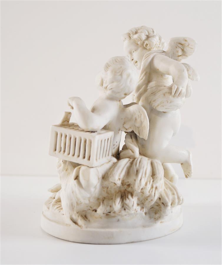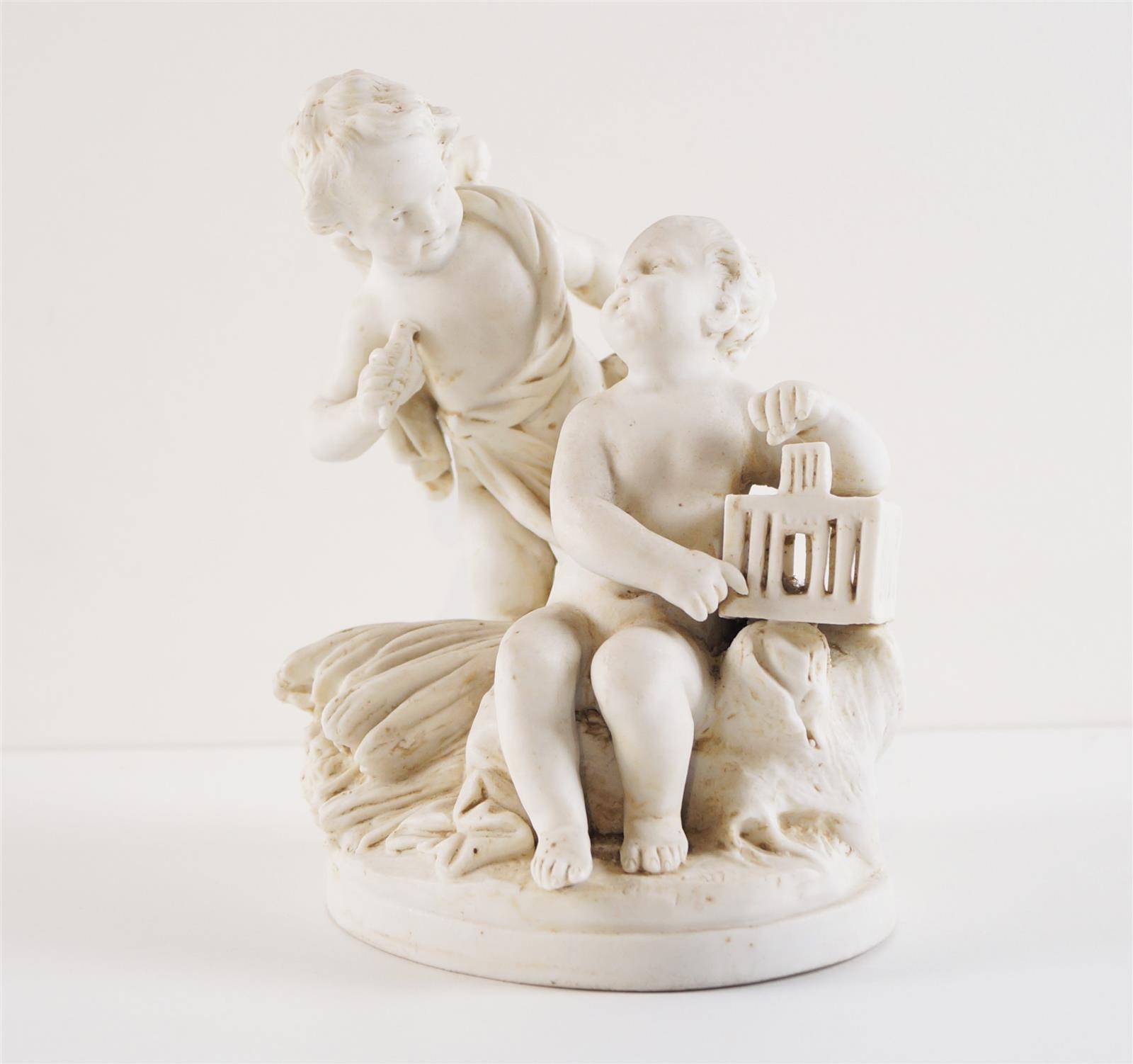"L'oiseau en cage", petit groupe en biscuit représentant 2 putti, signé sur la terrasse "Lefrançois", H. 16 cm (un éclat sur l'une des deux ailes).