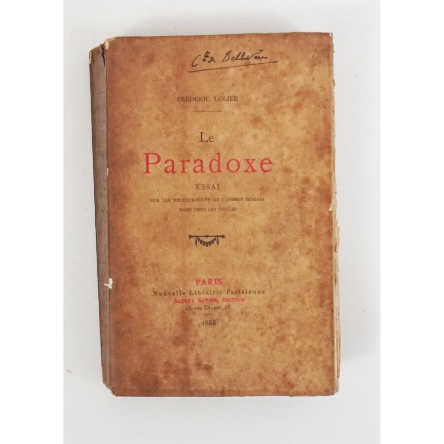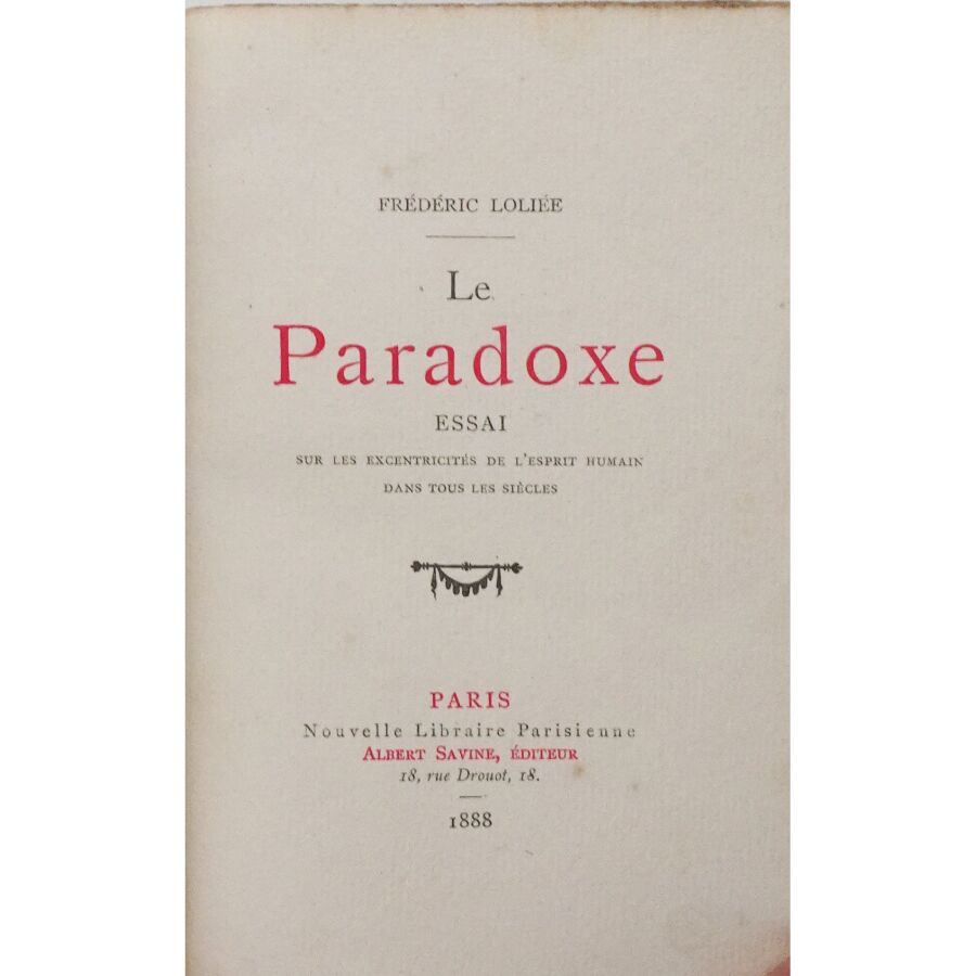 LOLIÉE (Frédéric). Le Paradoxe, essai sur les excentricités de l'esprit humain dans tous les siècles. Paris, Savine, 1888. In-16 broché, couv. parcheminée rempliée imprimée en noir et rouge (brunie).