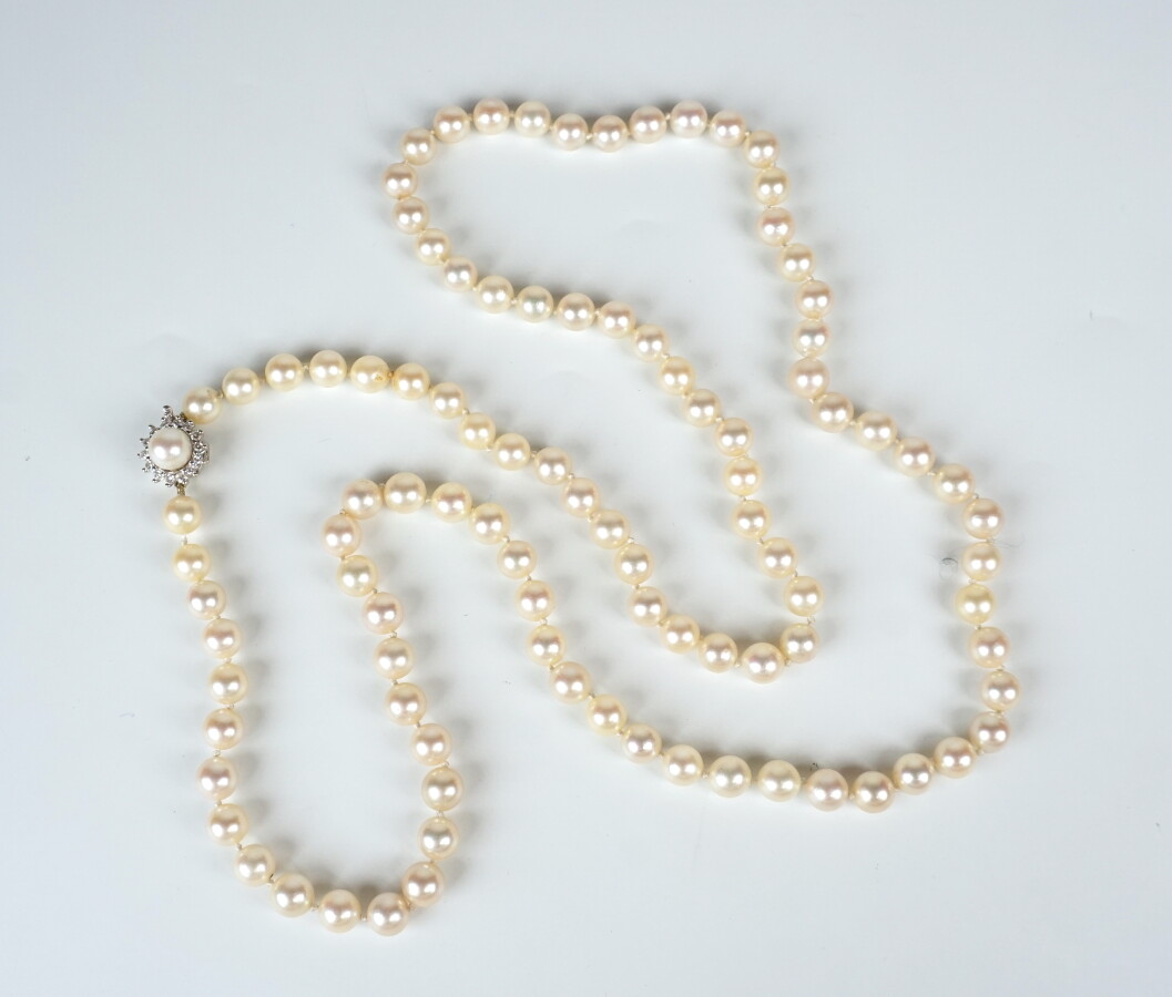 Long collier de perles de culture 7mm, fermoir "Fleur" en or gris 18K (750/oo) serti de diamants ronds, L. 80 cm. Poids brut : 54 g environ.