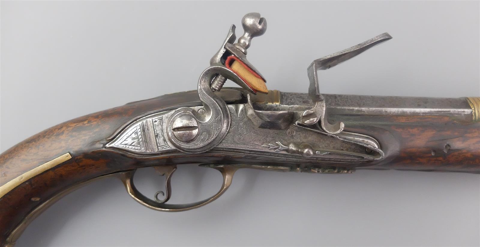 Long PISTOLET D'ARCON A SILEX, platine à silex marquée " I * P * IOSET A LIEGE " et chien col de cygne à corps plat légèrement gravé, bassinet en fer, contre-platine en laiton découpé avec crochet de ceinture en fer, canon à pans puis rond de 34 cm avec bagues en laiton, garnitures en laiton, fût en noyer (très légers manques), calotte à décor d'une tête de lion, baguette en bois, mécanisme semblant fonctionnel, longueur : 52,5 cm, milieu XVIIIème, ABE/BE.