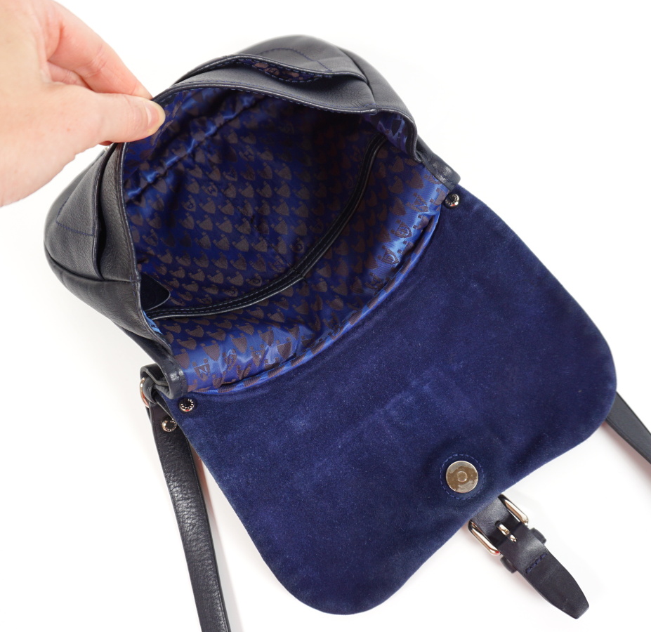 LONGCHAMP : Petit sac bandoulière "Balzane" en cuir bleu marine à rabat, fermeture aimanté agrémentée d'une boucle, 25 x 25 cm. Présenté avec son dustbag (bandes de cuir de la bandoulière à recoller sur 8 centimètres).