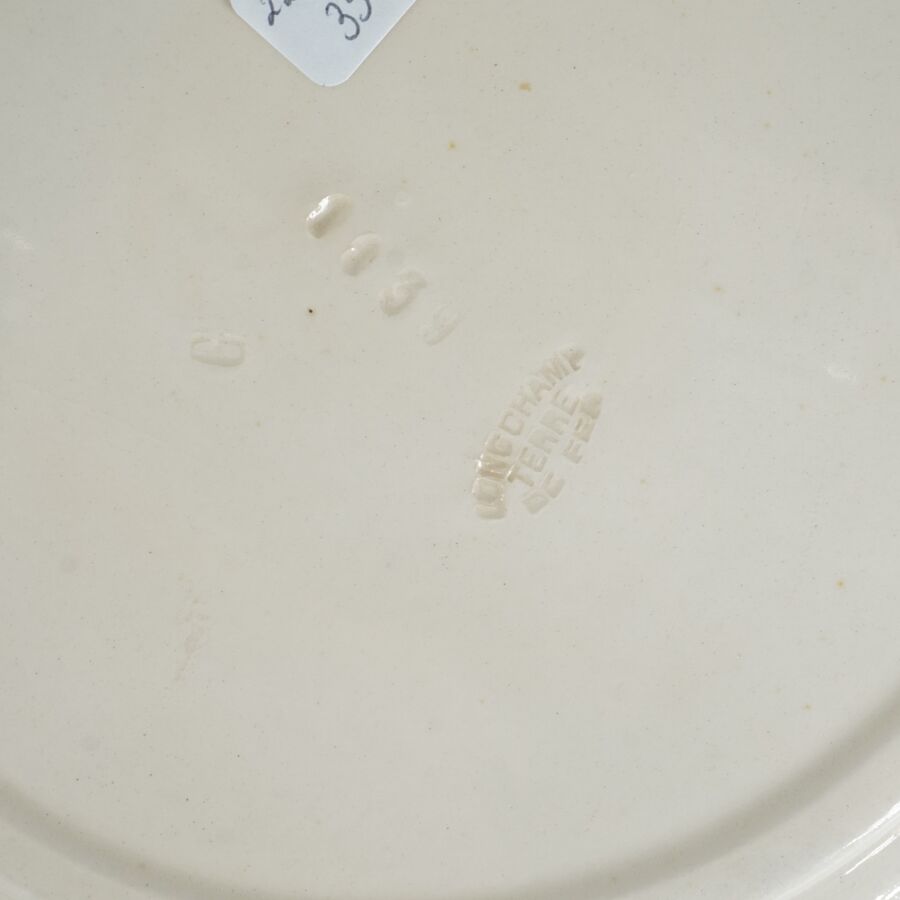 LONGCHAMPS : Six assiettes à asperges en faïence fine dite terre de fer, émaillée polychrome et à décor en relief d'asperges, marquées au revers, D. 26 cm (quelques éclats et restaurations).