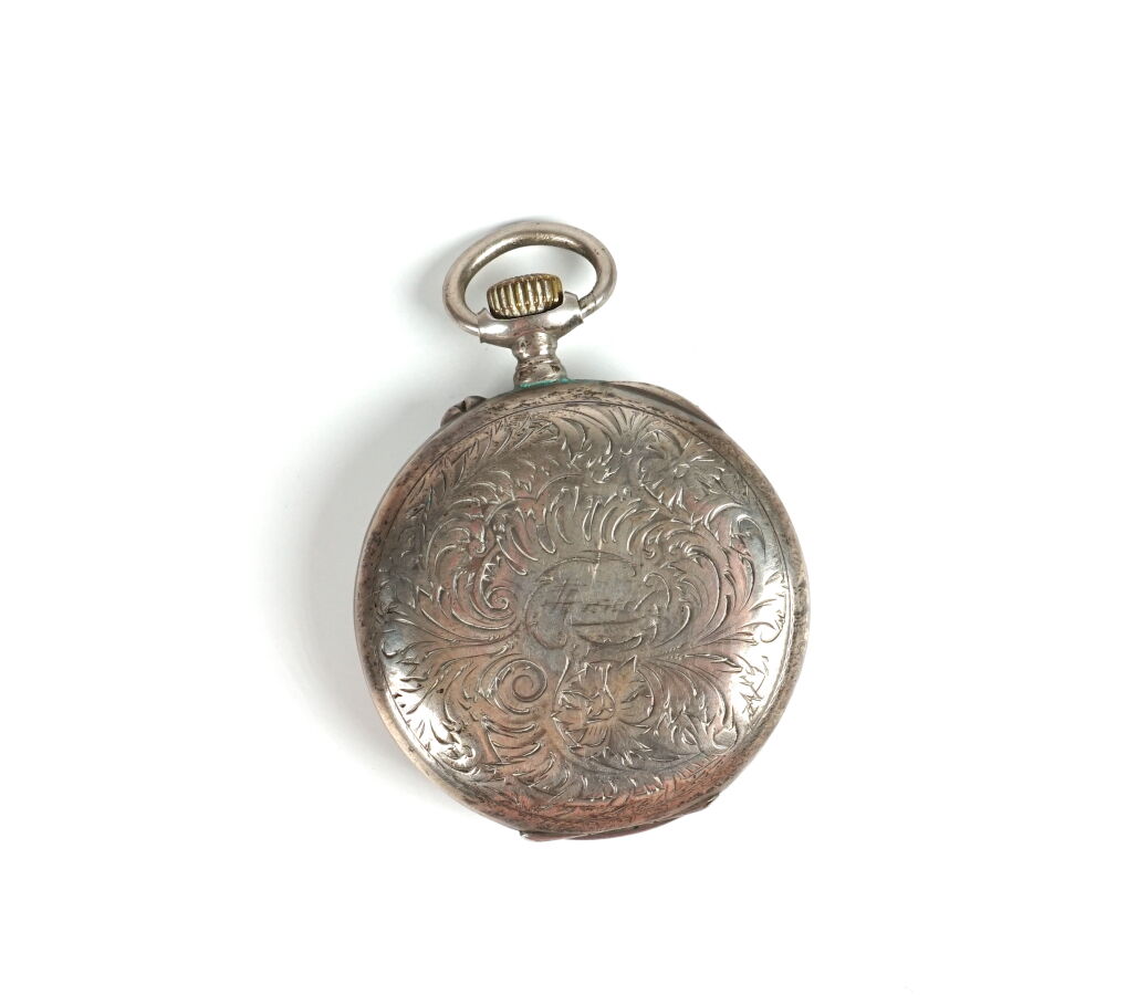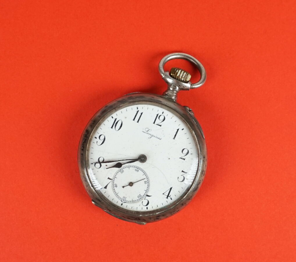 LONGINES : Montre de poche en argent (800/oo), à décor de feuillages ciselé, cadran émaillé blanc chiffres arabes, compteur des secondes, D. 5 cm, H. 6.8 cm (usures générales). Poids brut : 77.8 g environ.
