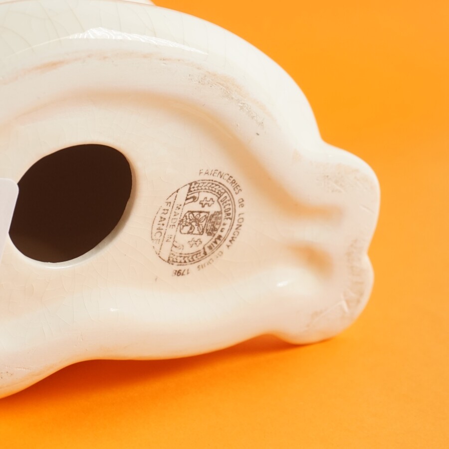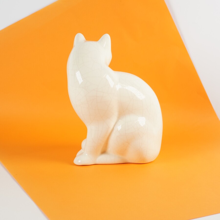 LONGWY - Chat assis, sujet en faïence émaillée polychrome, marqué au tampon dessous, H. 18 cm.