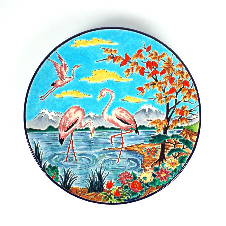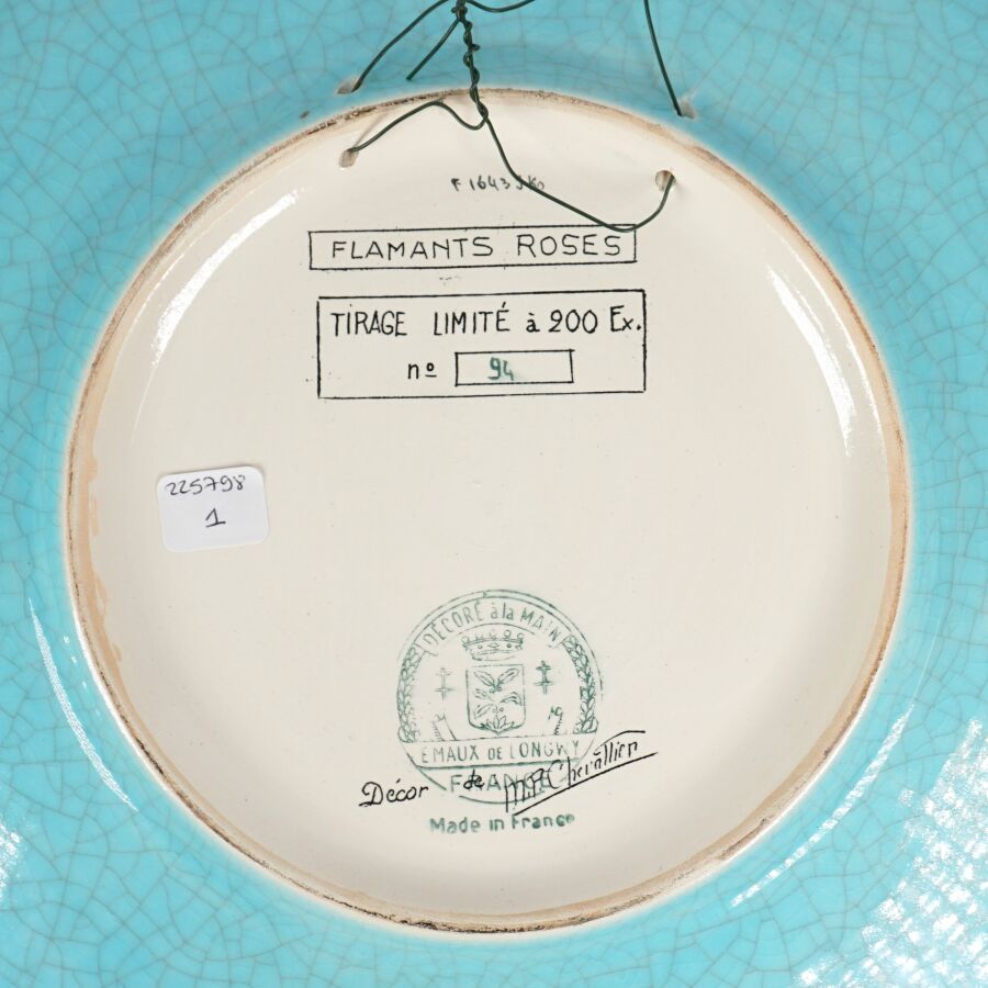 LONGWY : Plat en faïence émaillé polychrome, modèle "Flamants roses" décoré par M.P CHEVALLIER, signé, marqué et numéroté 94/200 ex sous la base, D. 37 cm.