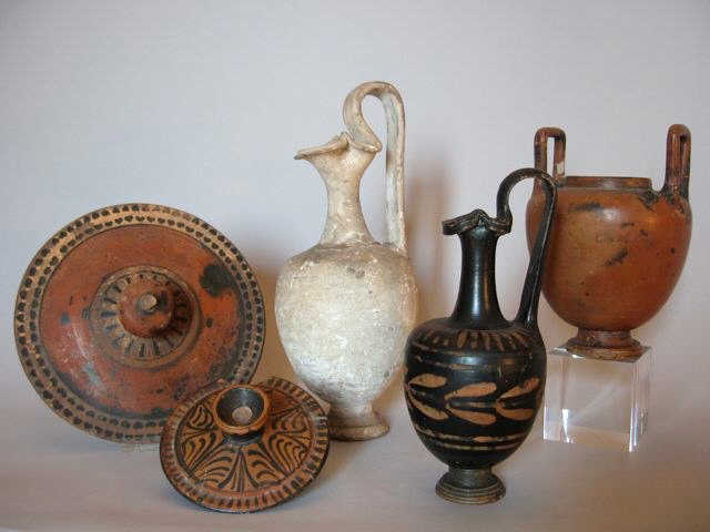 Lot composé de deux oenochoés, l'une peinte d'une frise végétale, d'un lébès à anses dressées, et de deux couvercles de vases ornés de languettes et de palmettes.. Terre cuite vernissée.. Cassures à un couvercle et aux anses du lébès.. Art Grec, Ve-IVe siècle av. J.-C.. Dim. de 10,2 cm à 25,2 cm. Portent des n° d'inventaire : 79, 94 et 158.