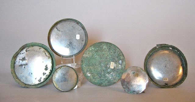 Lot composé de six miroirs circulaires, certains avec leur boitier.. Bronze.. Quelques déchirures.. Époque Romaine.. Diam. de 5,4 cm à 10,5 cm. Portent des n° d'inventaire : 233, 234, 235.