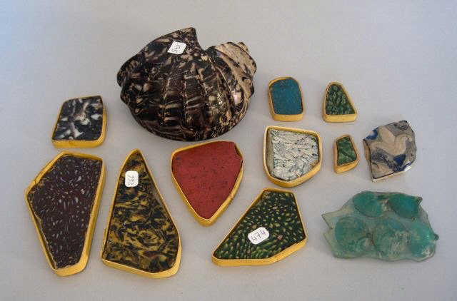 Lot composé d'un fragment de coupe godronnée à décor rubané aubergine et blanc, et de nombreux fragments de verres exhibant différentes techniques antiques.. . . Époque Romaine.. .