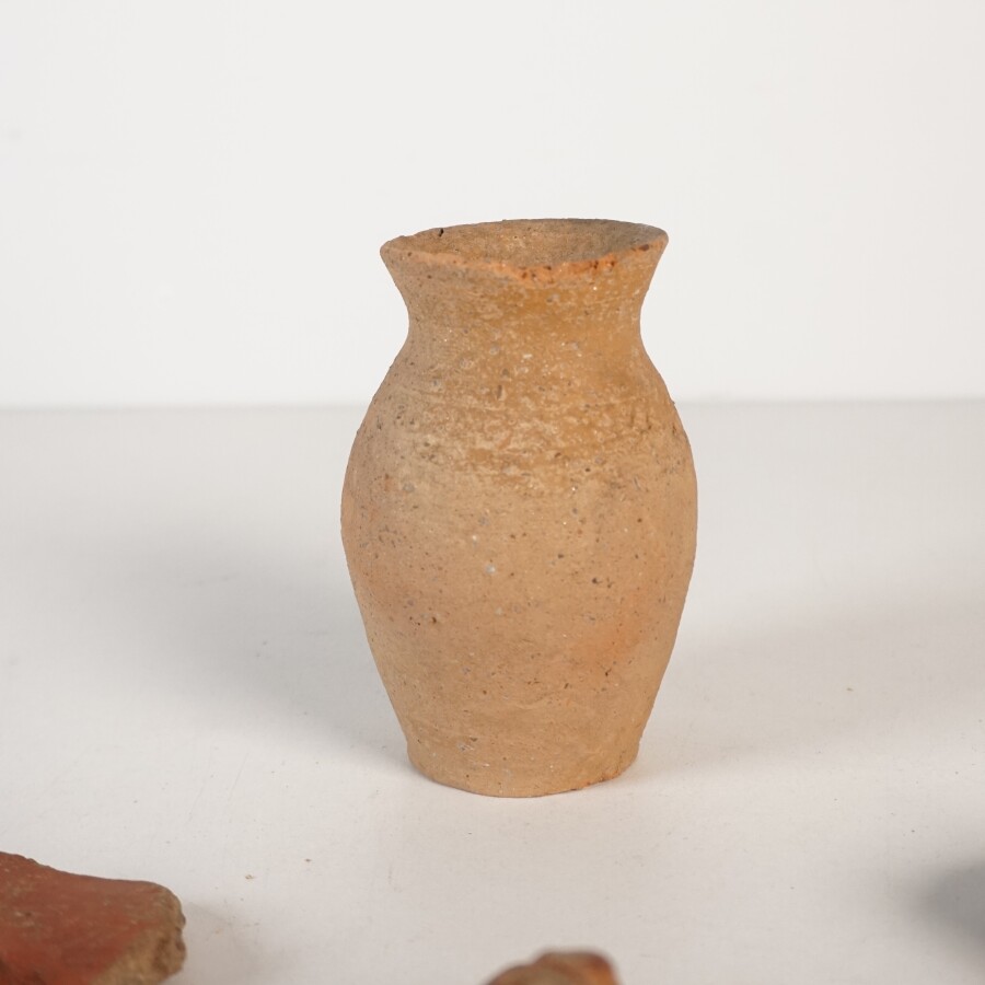 Lot comprenant deux balsamaires à haut col, un couvercle, une jarre et deux tessons.