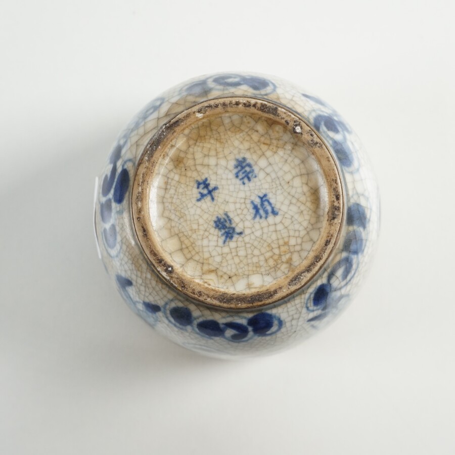 Lot comprenant une paire de coupes couvertes en céramique bleu blanc et une pipe à eau, Vietnam, 20ème siècle, H. 12 cm. H. Pipe à eau : 7 cm (usures).