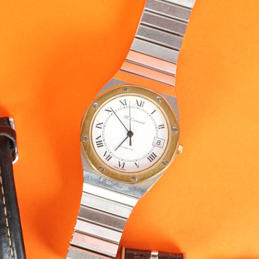 - M. GERARD : Montre bracelet pour homme en acier chromé et doré, cadran émaillé blanc, chiffres romains pour les heures, guichet dateur à 3h.