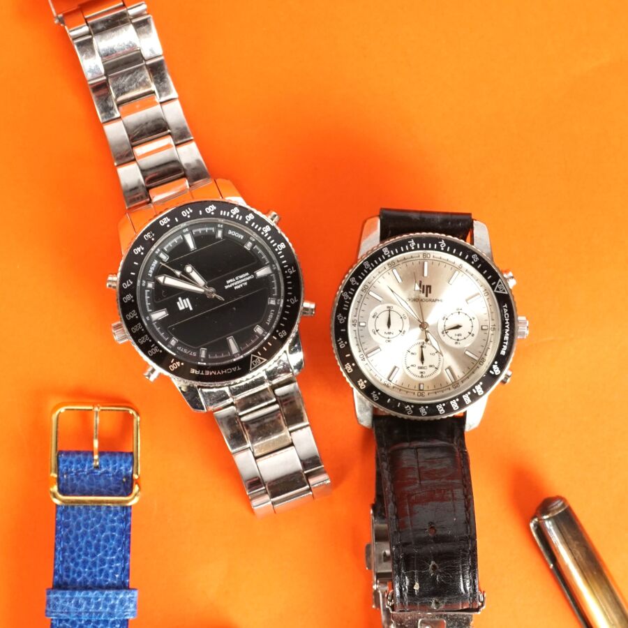 - LIP : Montre bracelet pour homme, boîtier rond, fond noir signé, chiffres arabes pour les heures, guichet dateur à 3h, mouvement à quartz, bracelet en cuir noir non d'origine