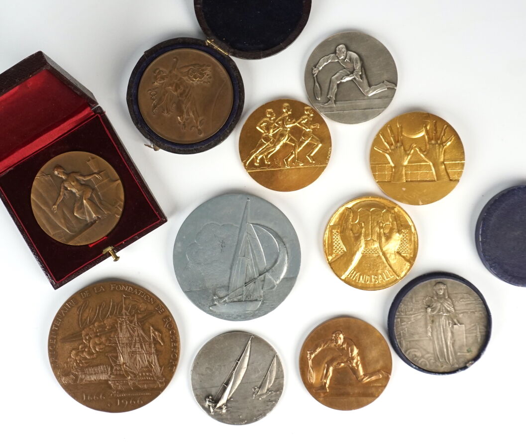 Lot de 11 médailles métaux et fabricants divers : Ville de Nantes, Chambre de commerce de Toulouse, ports, Tricentenaire de la fondation de Rochefort, Certificat d'études primaires à Toulouse, Navigation de plaisance.