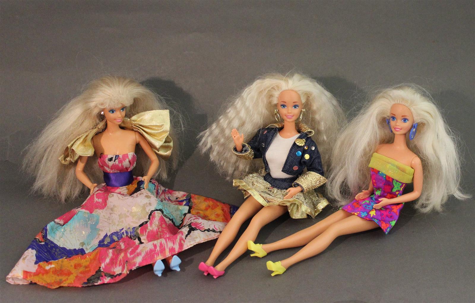 Lot de 3 poupées Barbie Mattel, vêtements d'époque, tenues habillées, dont une avec mécanisme au dos