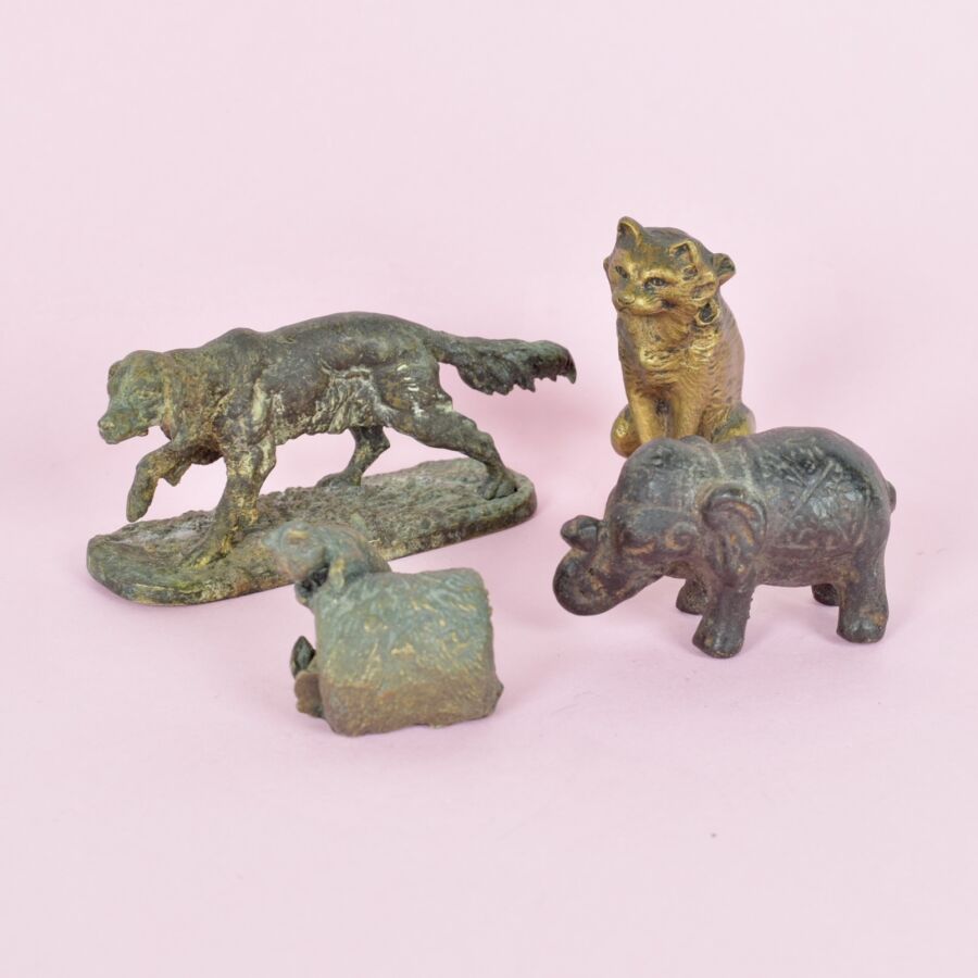 Lot de 3 sujets en étain et métal figurant un éléphant, un chat et chien d'arrêt. Long. maximale : 8.5 cm