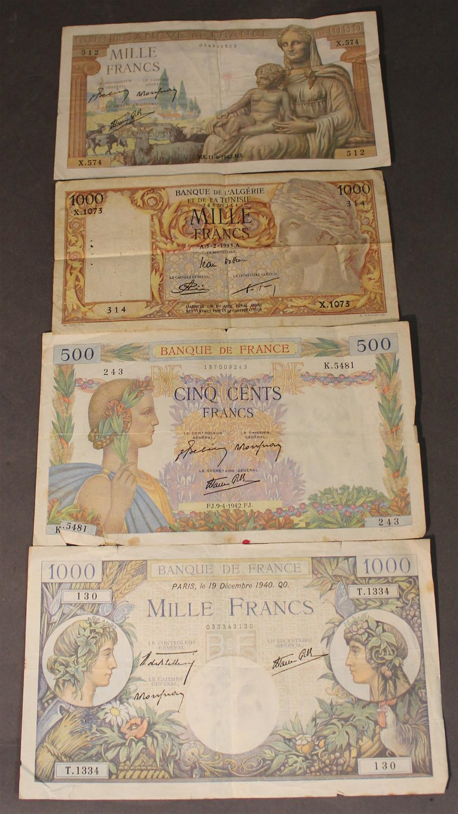 Lot de 4 billets, comprenant : 1 billet de 1000 Frs numéroté X.574, 014346512 (quelques pliures, déchirure en bas à gauche et quelques trous), 1 billet de 1000 Frs (banque de l'Algérie et de la Tunisie), numéroté X.1073, 26821314 (quelques déchirures, trous et taches), 1 billet de 1000 Frs, "Paris, le 19 décembre 1940.QO.", numéroté T.1334, 033343130 (déchirures et taches) et 1 billet de 500 Frs, numéroté K.5481, 137009243 (déchiré/recollé avec deux timbres au dos, taches et quelques autres déchirures)