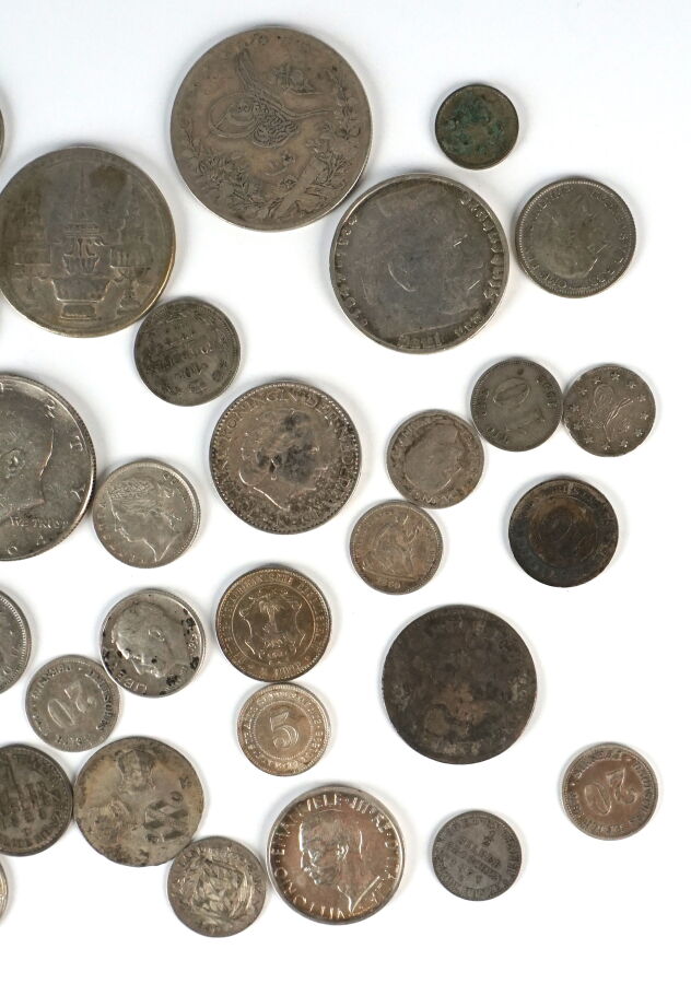 Lot de 40 monnaies argent de différents titres, essentiellement XIX et XXème siècle, dont : Thaïlande, Autriche, Sardaigne, Vatican, Usa, Suède, Allemagne états et colonies, Pays bas, Italie, Belgique, Angleterre et colonies, Russie, Pérou, Grèce, Turquie, Arabie Saoudite. B à SUP. Poids total : 160 g environ.