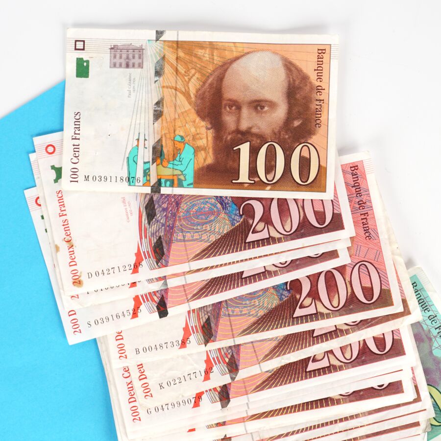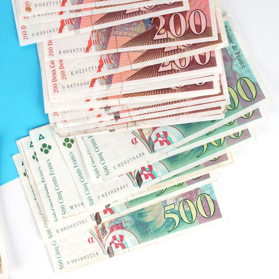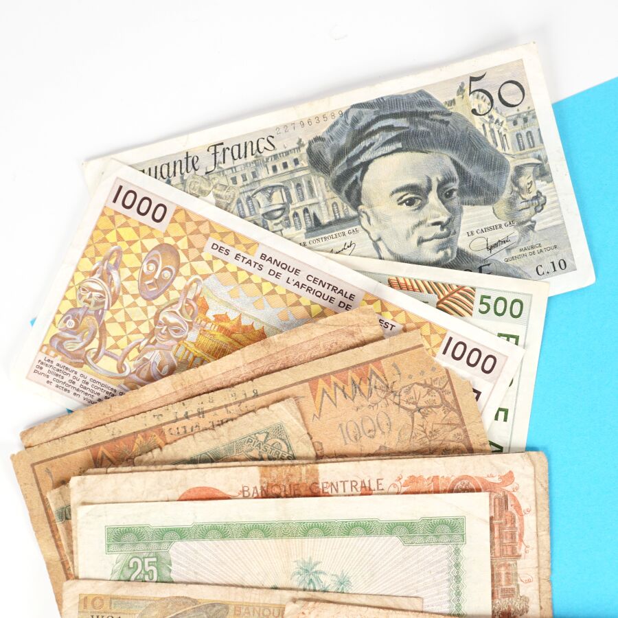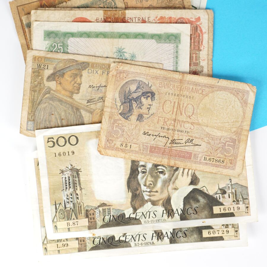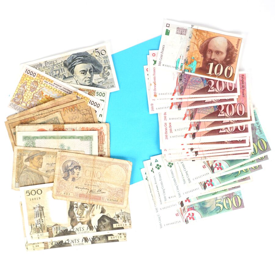 Lot de 41 Billets de banque dont : Banque de France 500 Frcs Pascal, 500 Frcs Pierre et Marie Curie, 200 Frcs Eiffel, 100 Frcs Cézanne, 50 Frcs Quentin de la Tour 500 et 1000 Frcs BCEAO, Guinée, Algérie, Afrique Occidentale, etc.