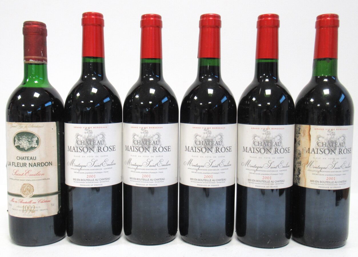 Lot de 6 blles comprenant : 1 Blle CH. LA FLEUR NARDON St Emilion 1992 5 Blles CH. MAISON ROSE Montagne St Emilion 2001 A prendre en l'état.