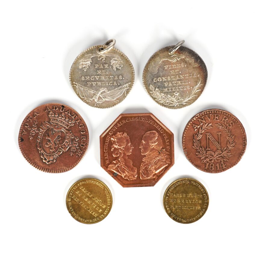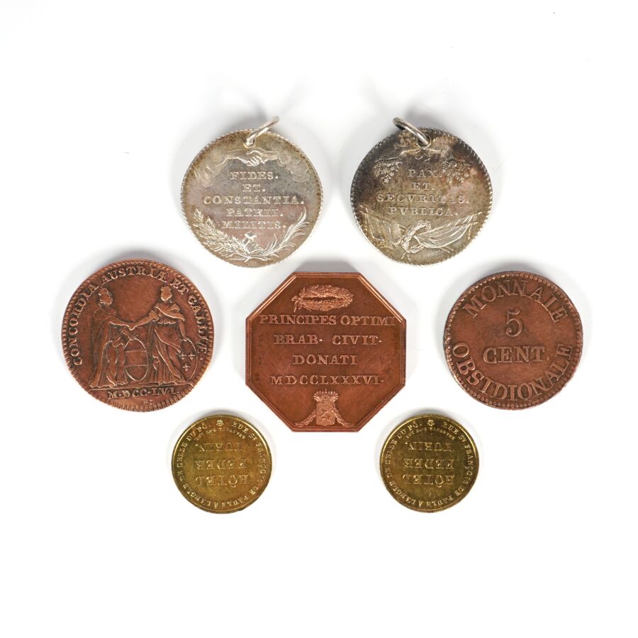 - PAYS-BAS MÉRIDIAUNAUX : 2 jetons argent 1791 nd Bruxelles : A/ Fides Et Constantia Patrii Militis , R/ Pax et Securitas Publica, Poids brut :18,28 g environ (troués pour servir de décoration militaire Autrichienne),