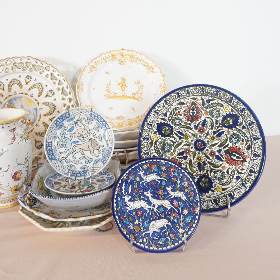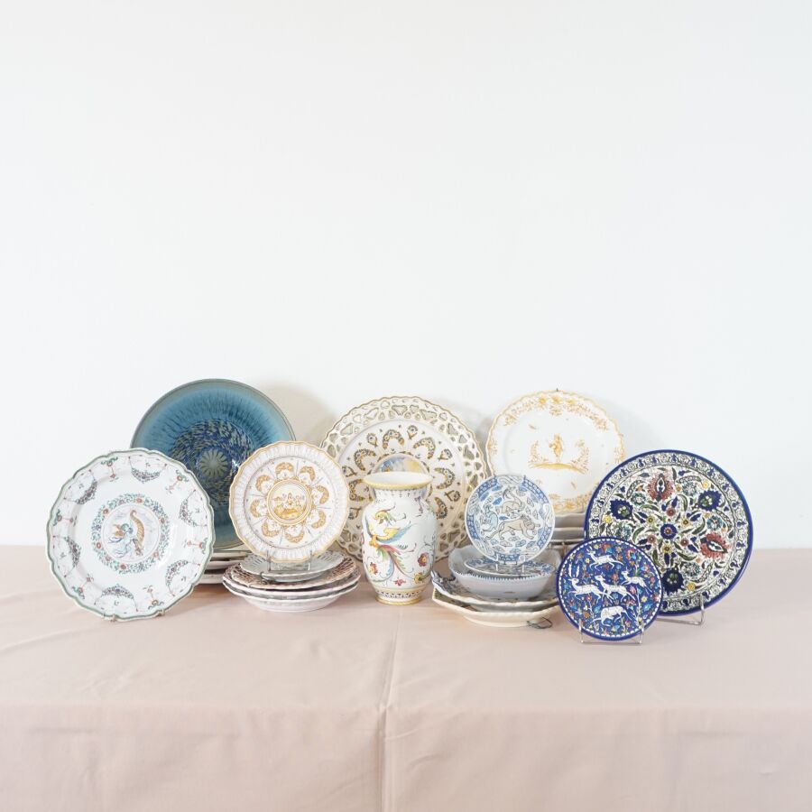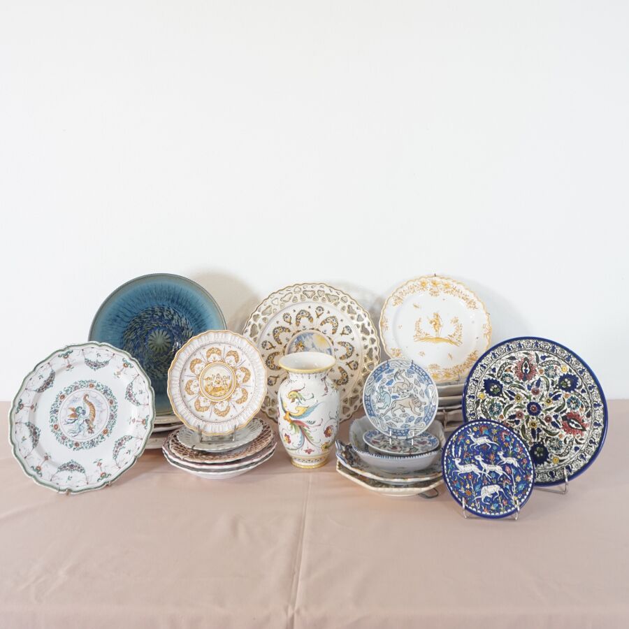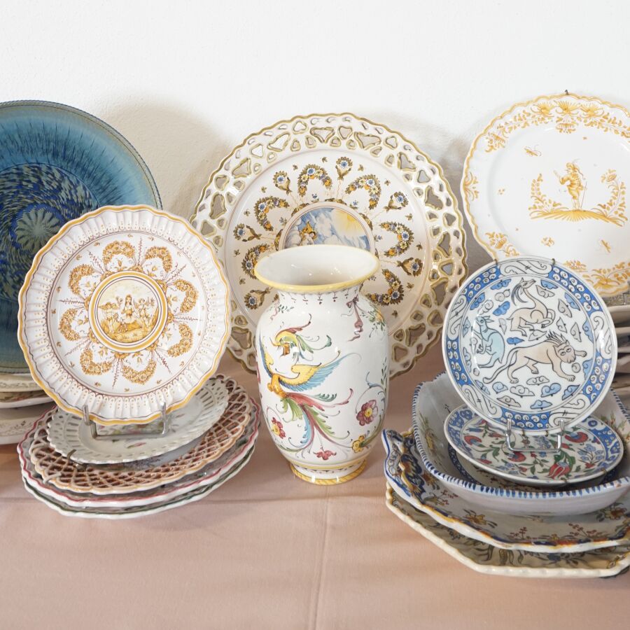 Lot de céramiques diverses, dont assiettes, coupes et plats, en faïence dont MOUSTIERS, on y joint un vase signé LACUCCI (divers formats, usures et éclats).