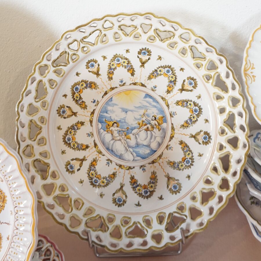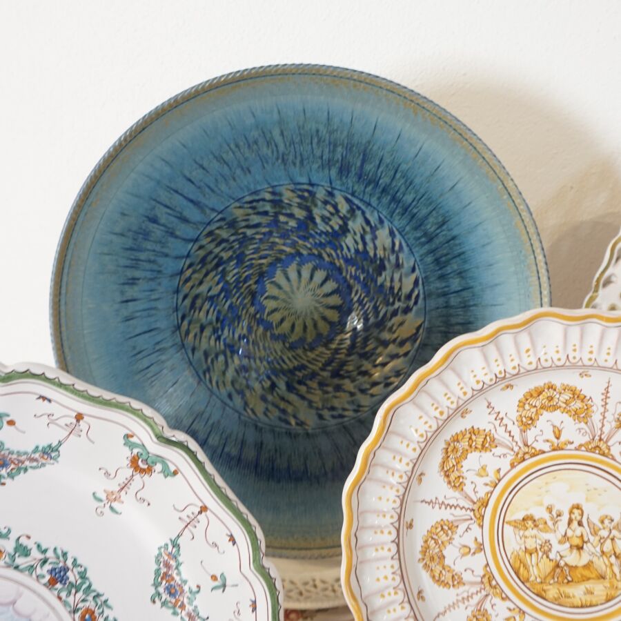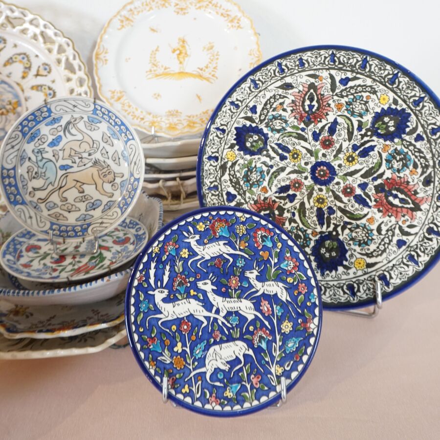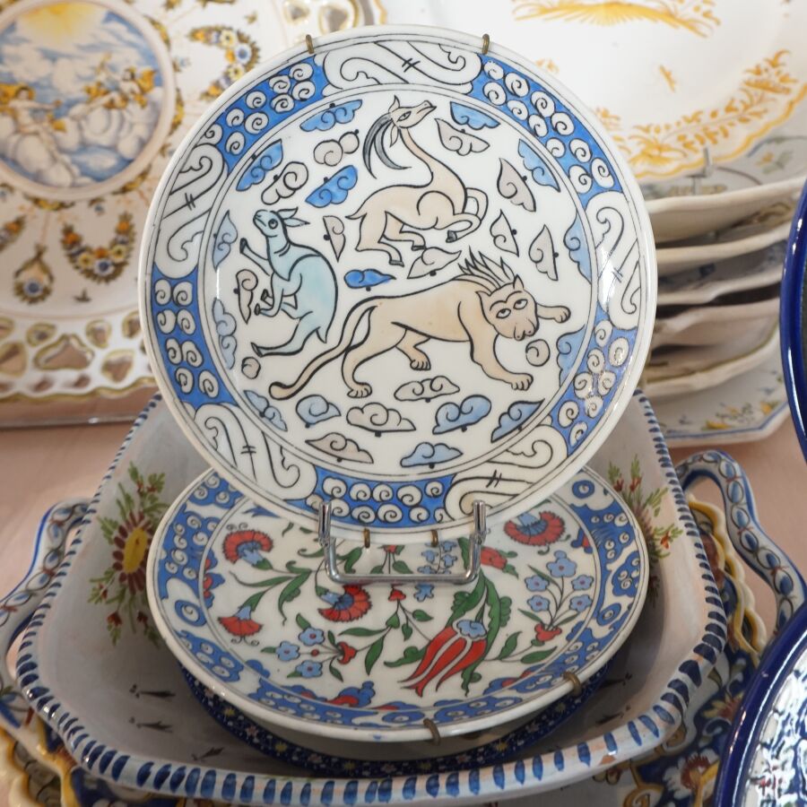 Lot de céramiques diverses, dont assiettes, coupes et plats, en faïence dont MOUSTIERS, on y joint un vase signé LACUCCI (divers formats, usures et éclats).