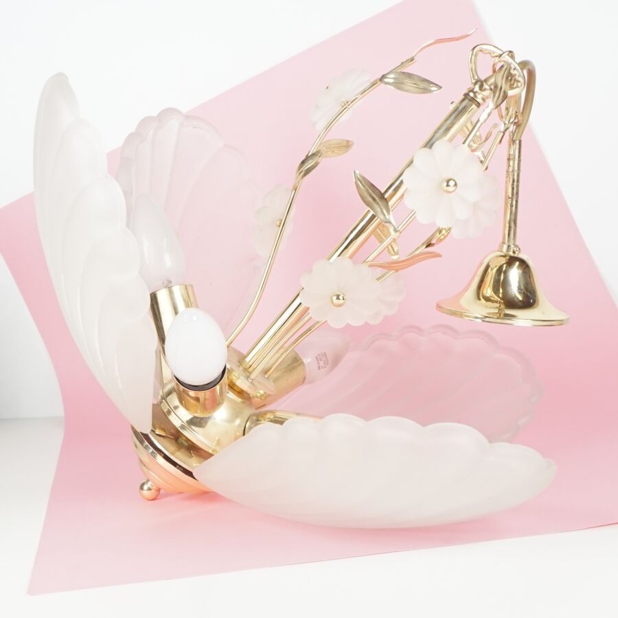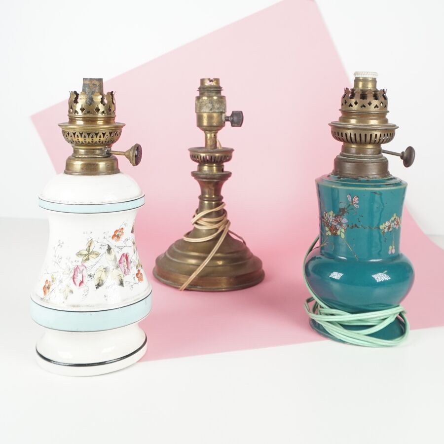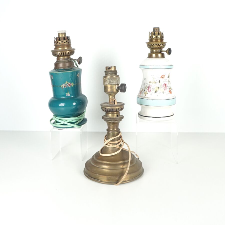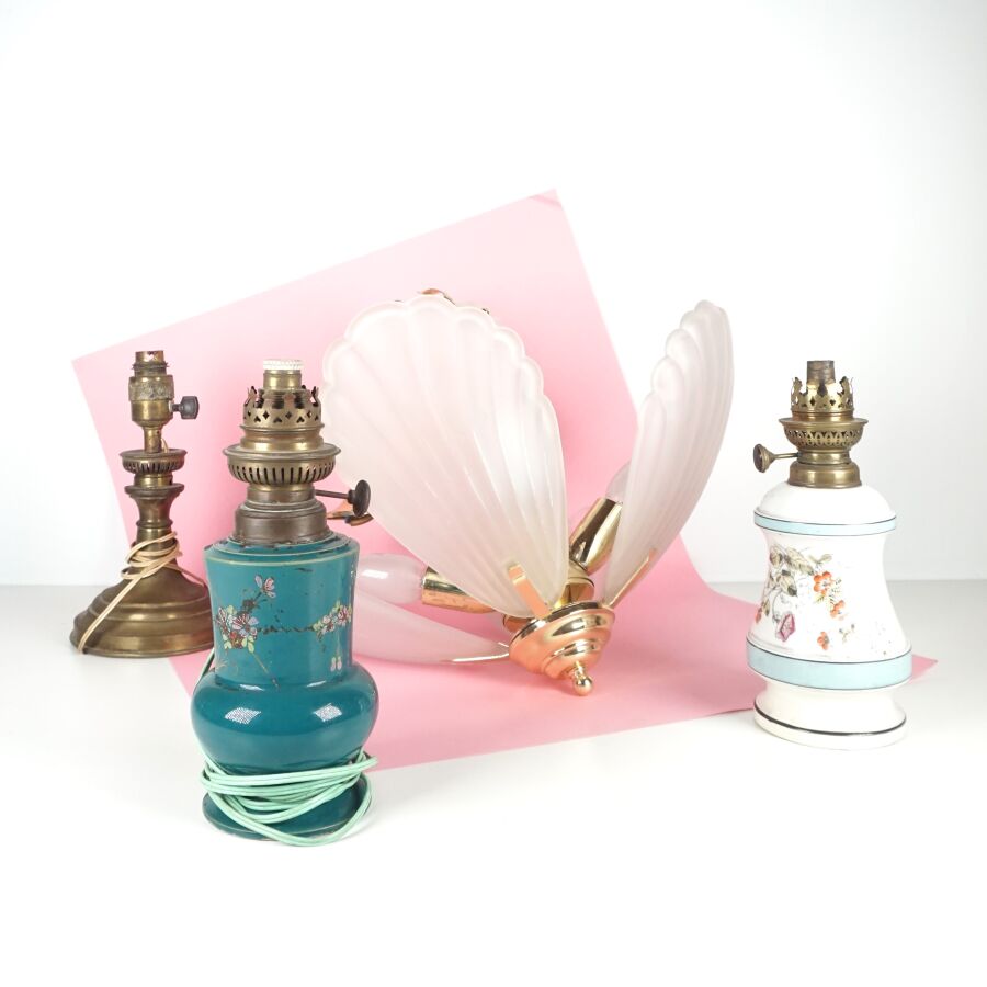 Lot de luminaires comprenant un lustre en opaline et métal doré et lampes à pétrole, H. 54 cm