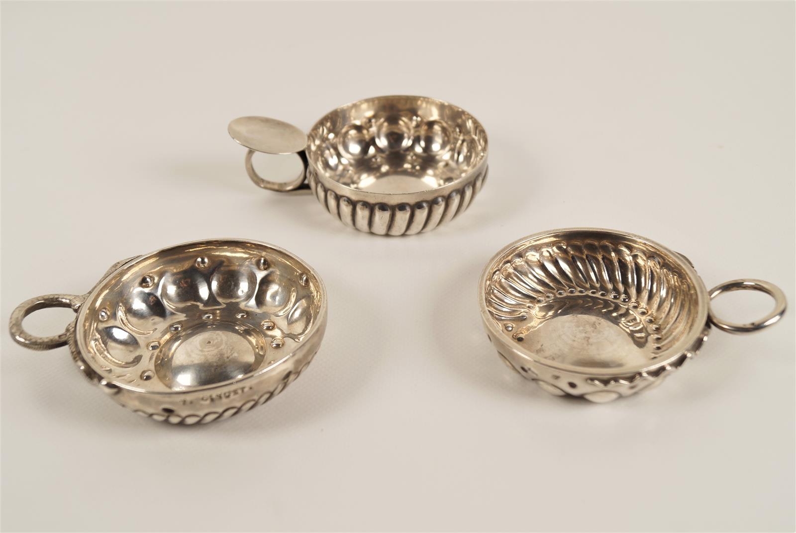 Lot de trois taste-vins en argent massif, poinçon Minerve, à décor de cotes torses et pastilles, deux marqués "T. CINGET" présentant des anses aux serpents. Poids brut : 220 g environ.