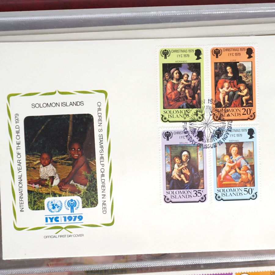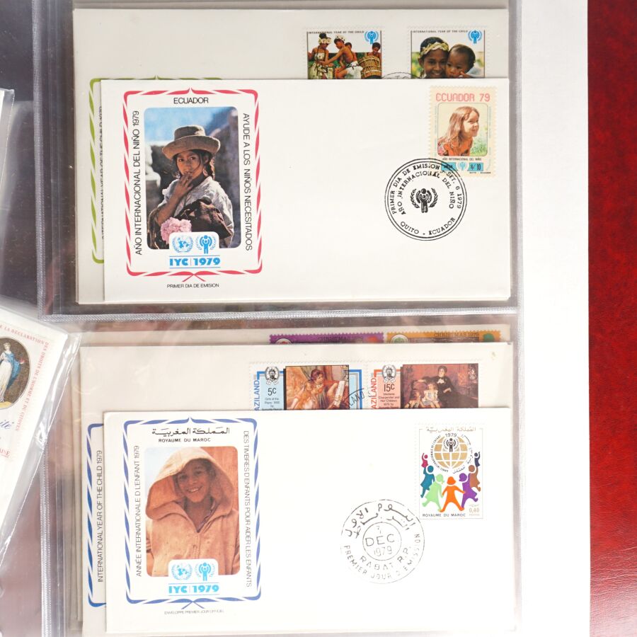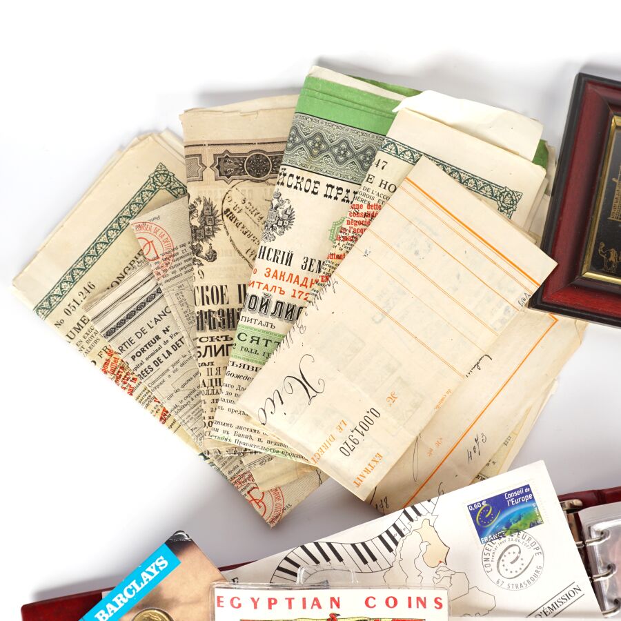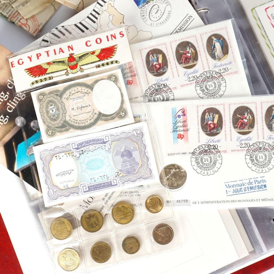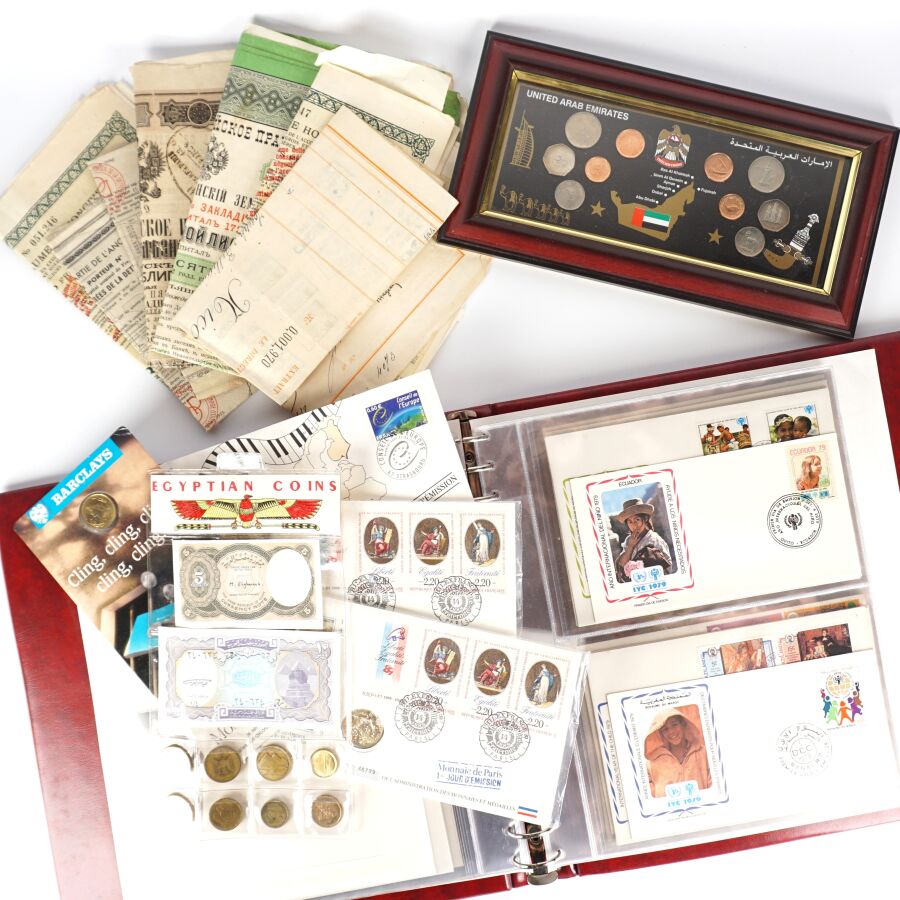 Lot divers comprenant : Classeur d'enveloppe Premier Jour " Année Internationale de l'Enfant, 3 enveloppes avec monnaies de 2€ Finlande 2006, 2 jetons " prise de la Bastille 1989, jeton Europa, set "Egyptian coins", set "United Arab Emirates" encadré et un petit lot de titres de bourses dont Russe, Empire Ottoman, Hongrie, Dette Public 1932.