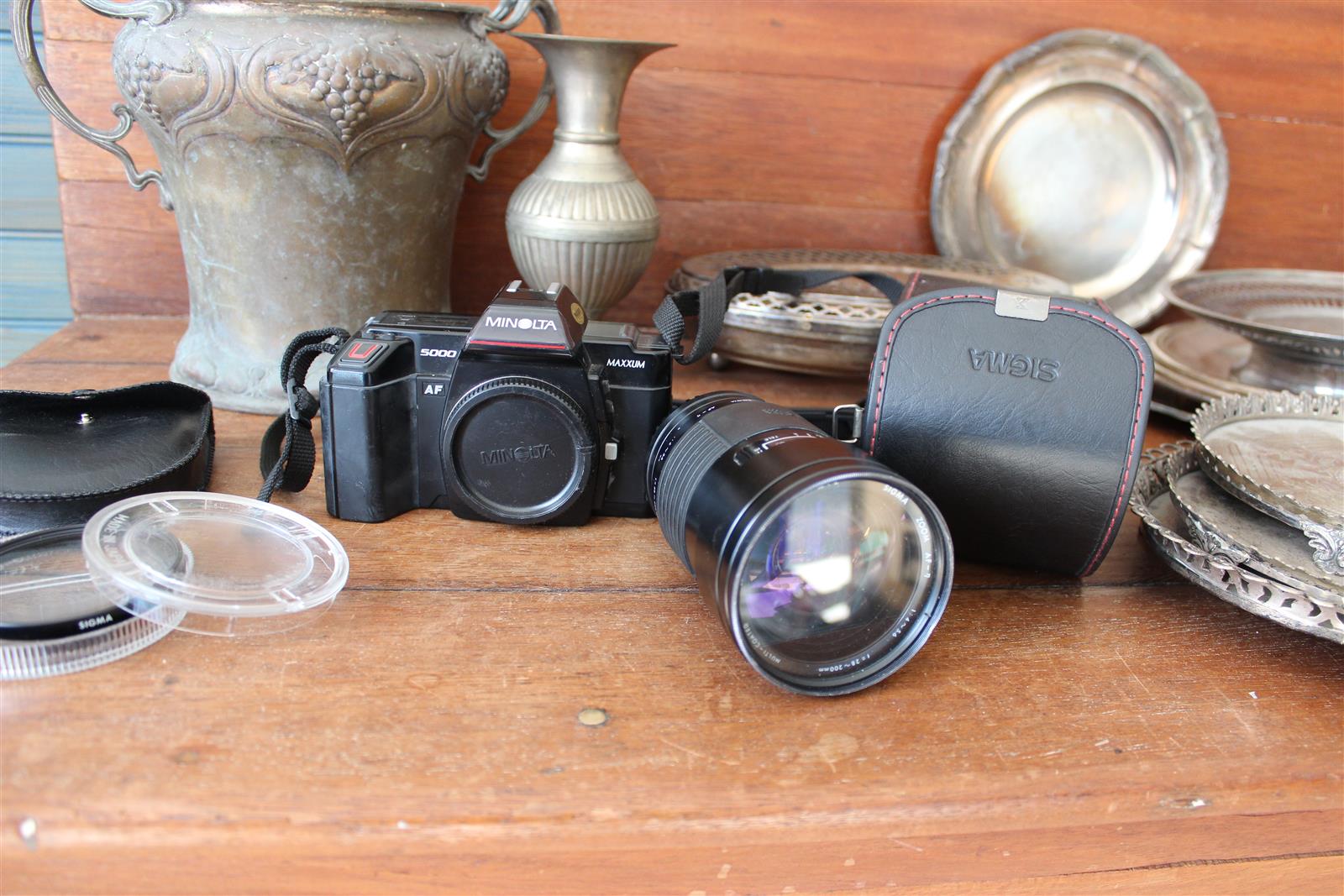 Lot en métal argenté, comprenant : un chauffe-plat, un pot à anses à décor de grappes de raisins, vase, assiettes et dessous de plat. On y joint un appareil photo de marque MINOLTA 5000 n°57106360 Japan, avec son objectif (en l'état)