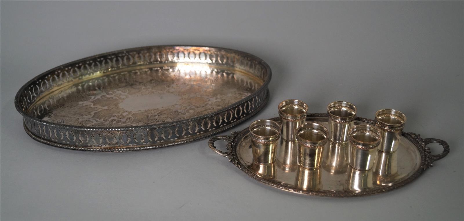 Lot en métal argenté comprenant un plateau ovale ciselé à bords ajourés et un service à liqueur comprenant 6 gobelets sur un plateau