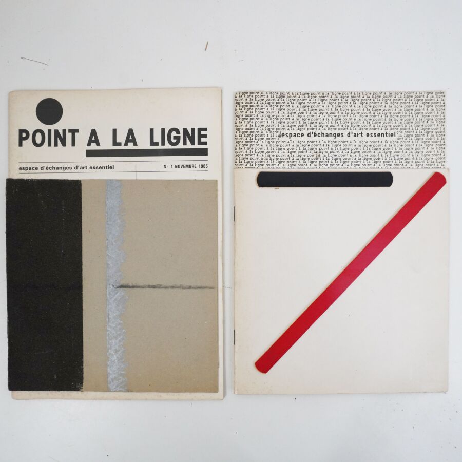 - Point à la ligne (espace d'échanges d'art essentiel) n°3-4 avril 1986. In-4 broché, couverture imprimée, avec deuxième couverture partielle cartonnée ornée d'un collage de languettes de cartons rouge et noire en relief. Reproductions en noir.